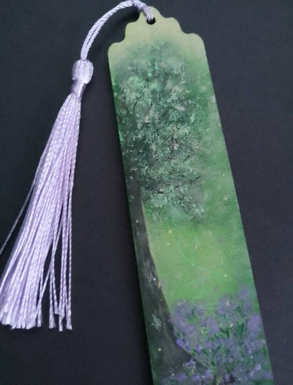 "Bluebell Woods" is an original acrylic painting on a plywood bookmark. A tree stands tall in this painting towering over the pretty delicate bluebells below with the sun shining through.