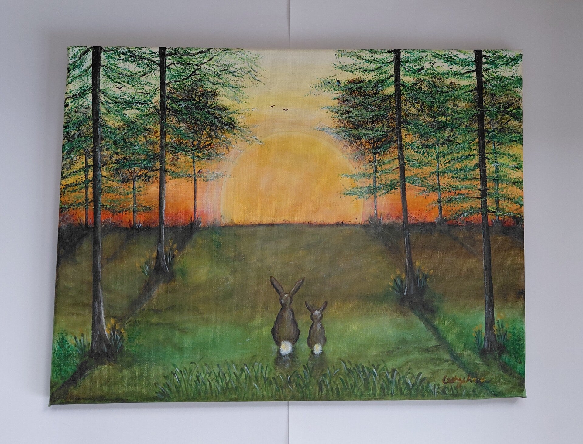 I added two birds in the trees, a little robin and a blue tit, and birds flying in the distance. Two hares stare at the glorious sunset among the trees in this calm and beautiful place.