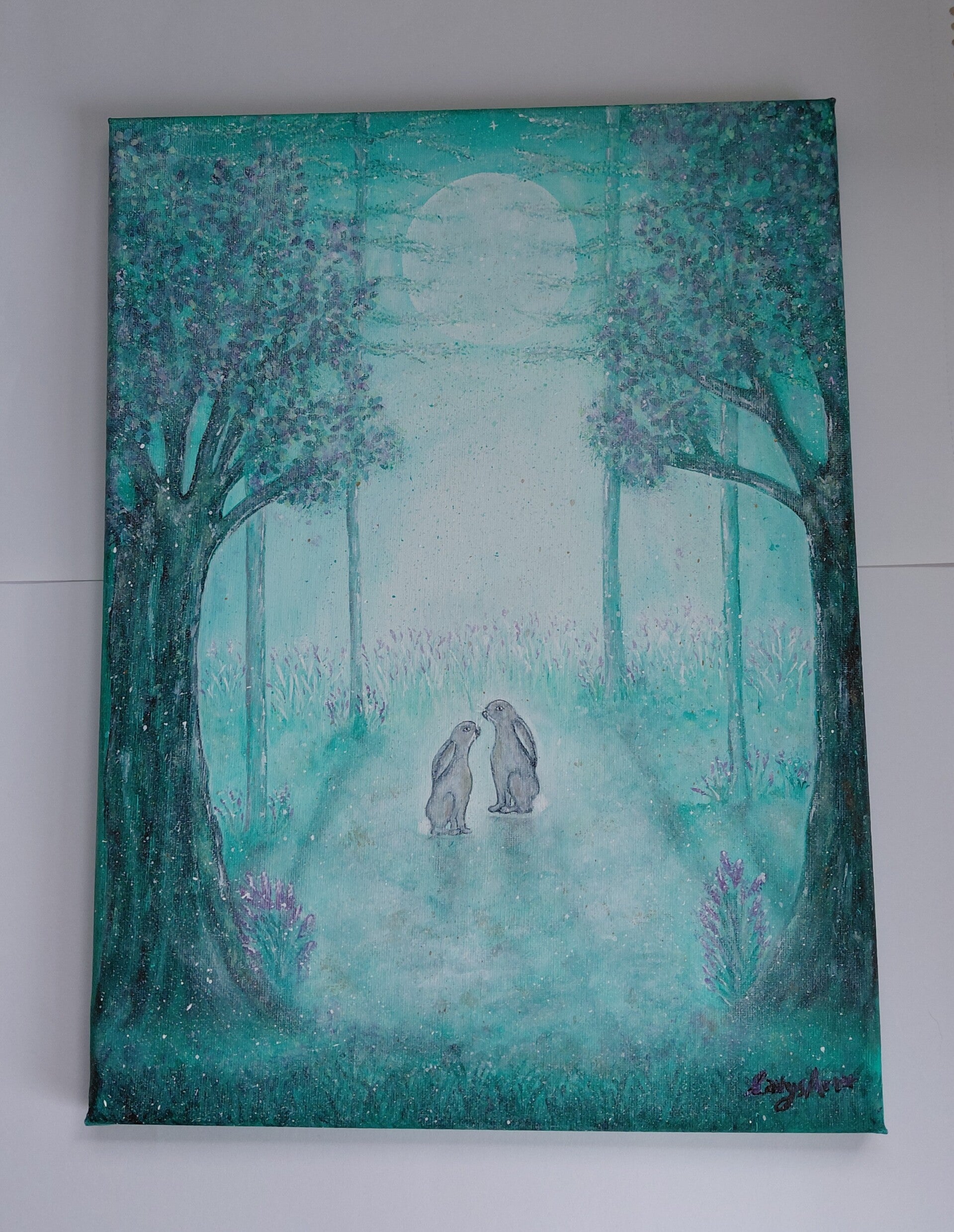 Introducing "The Dreamy Forest", a magical scene from my imagination, with green and lilac trees, beautiful delicate lilac flowers. Come and join the two hares under the moonlit sky and twinkling stars.