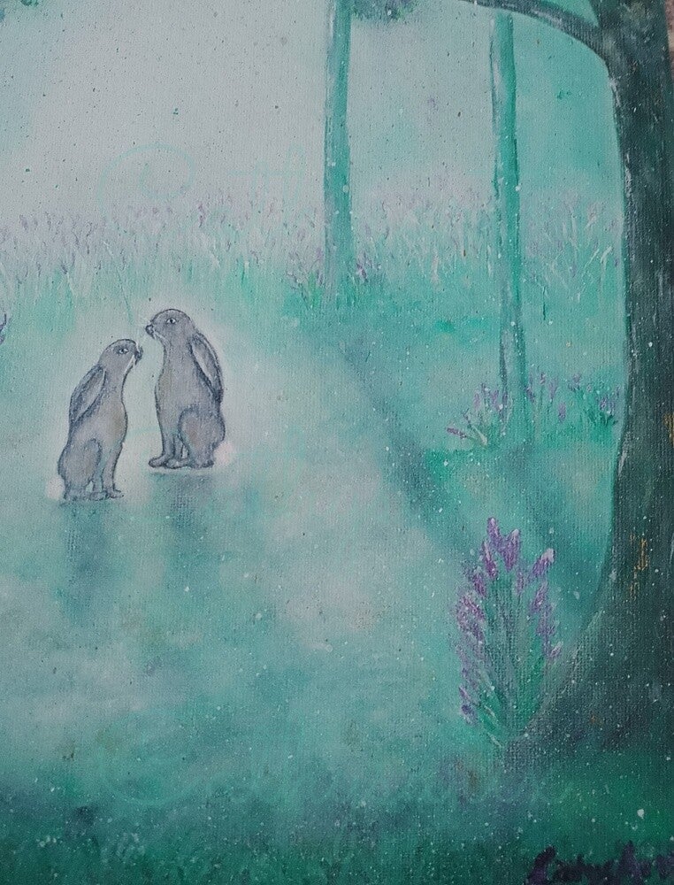 Introducing "The Dreamy Forest", a magical scene from my imagination, with green and lilac trees, beautiful delicate lilac flowers. Come and join the two hares under the moonlit sky and twinkling stars.