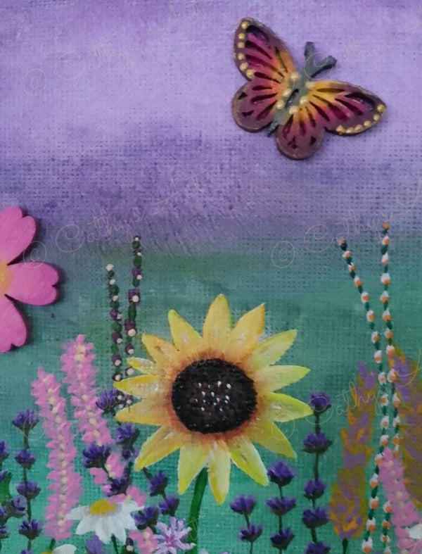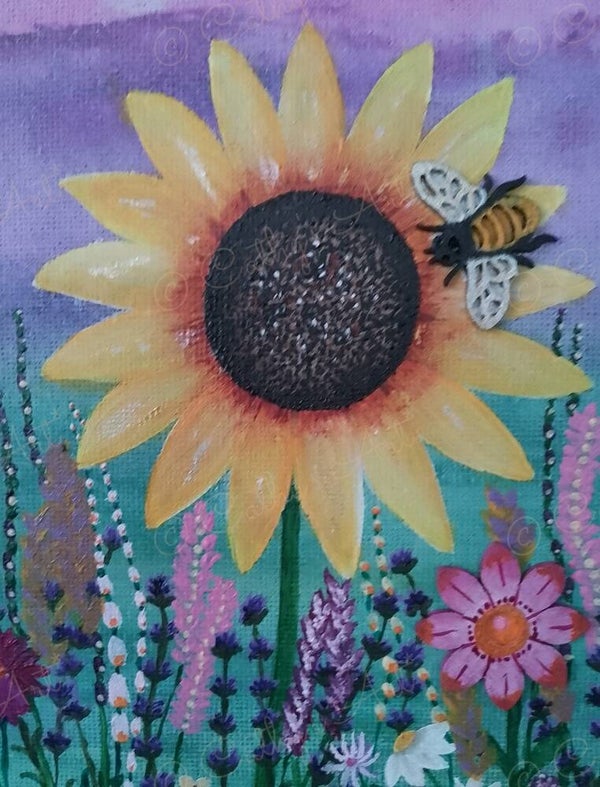 I have a passion and love for flowers, bees and butterflies. Especially sunflowers. I am always inspired to paint them and I like to experiment with different ways of painting them. "Flowers of my dreams" is painted on a stretched canvas measuring 25 cm x 30 cm. I have used different tones of yellows, purples, pinks and greens for the background with acrylic paints.