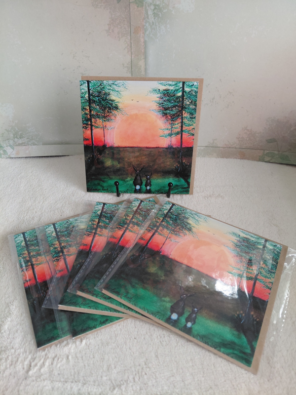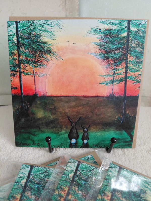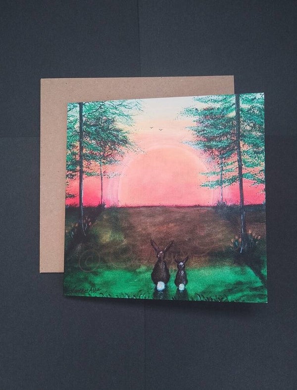 "Tranquil Sunset" is a beautiful peaceful scene with two adorable hares watching the sunset from the magical forest.