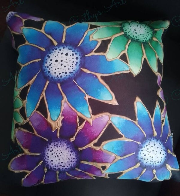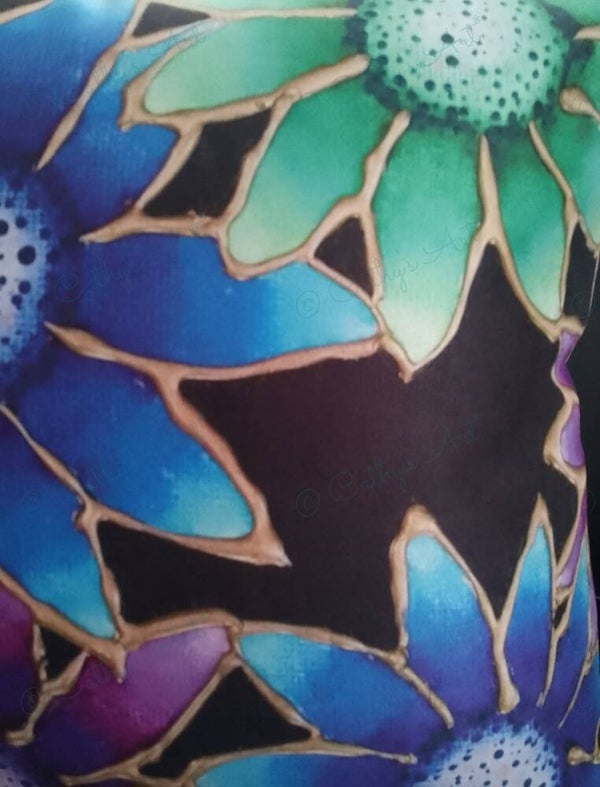 "Flower Dots" is in colours of blues, greens, purples, black and gold.