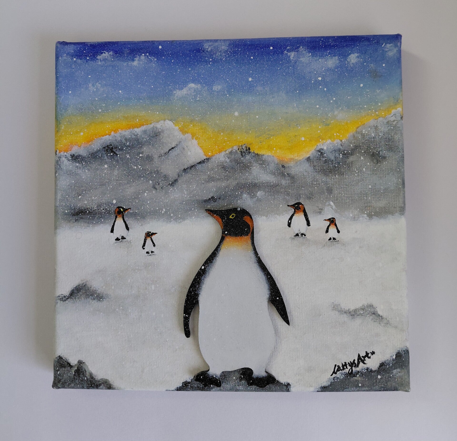 Introducing "SNOWFLAKES", original acrylic painting on 20 x 20 cm stretched canvas with 3D MDF hand painted penguin π§π§