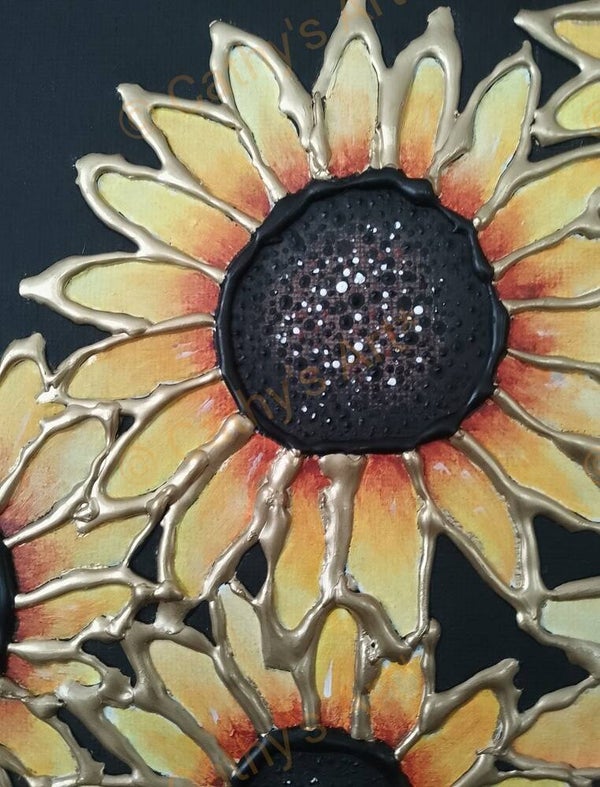 For this one I used a glue gun to draw the flowers on the canvas, then painted the petals using acrylic paints and acrylic paint pens. The outline of the sunflowers is painted with a metallic gold paint pen. For the centre I used paint brushes and dotting tools to create the dots.