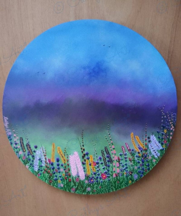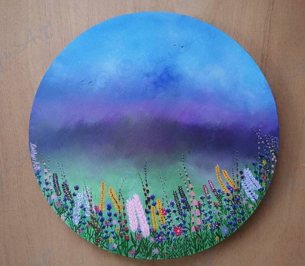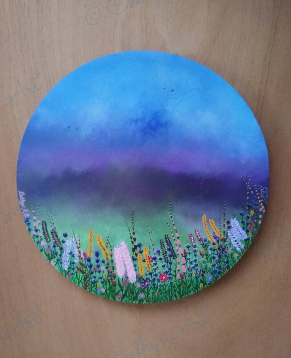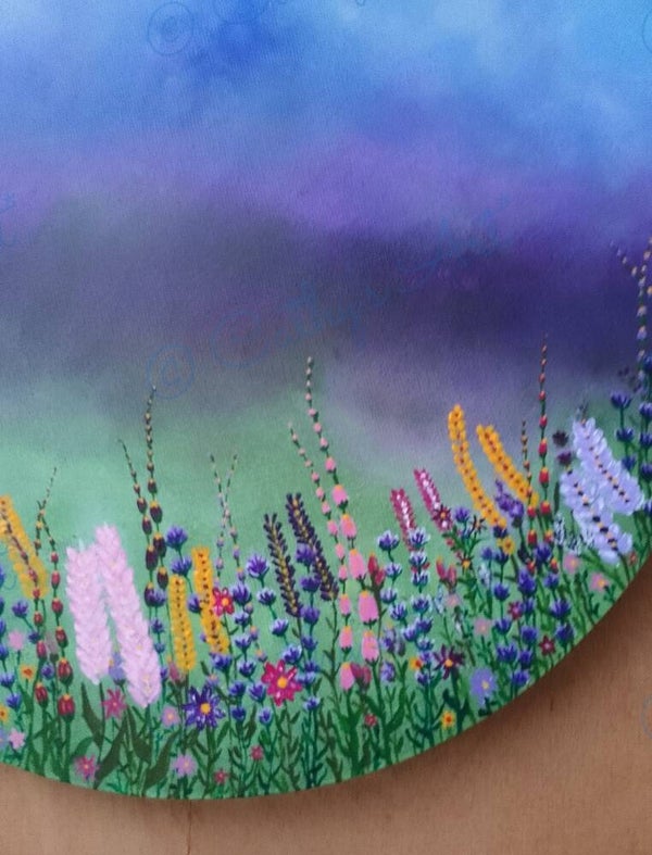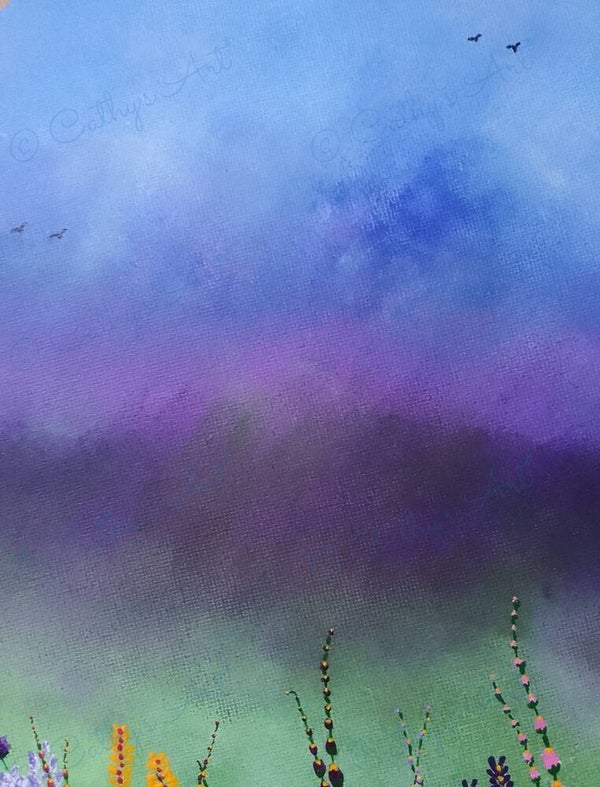 The flowers cover the bottom section of the canvas in colours of purples, lilacs, yellows, and pinks. I wanted to create a field of wild flowers all entwined, reaching towards the sky. For finishing touches I added birds flying in the distance.