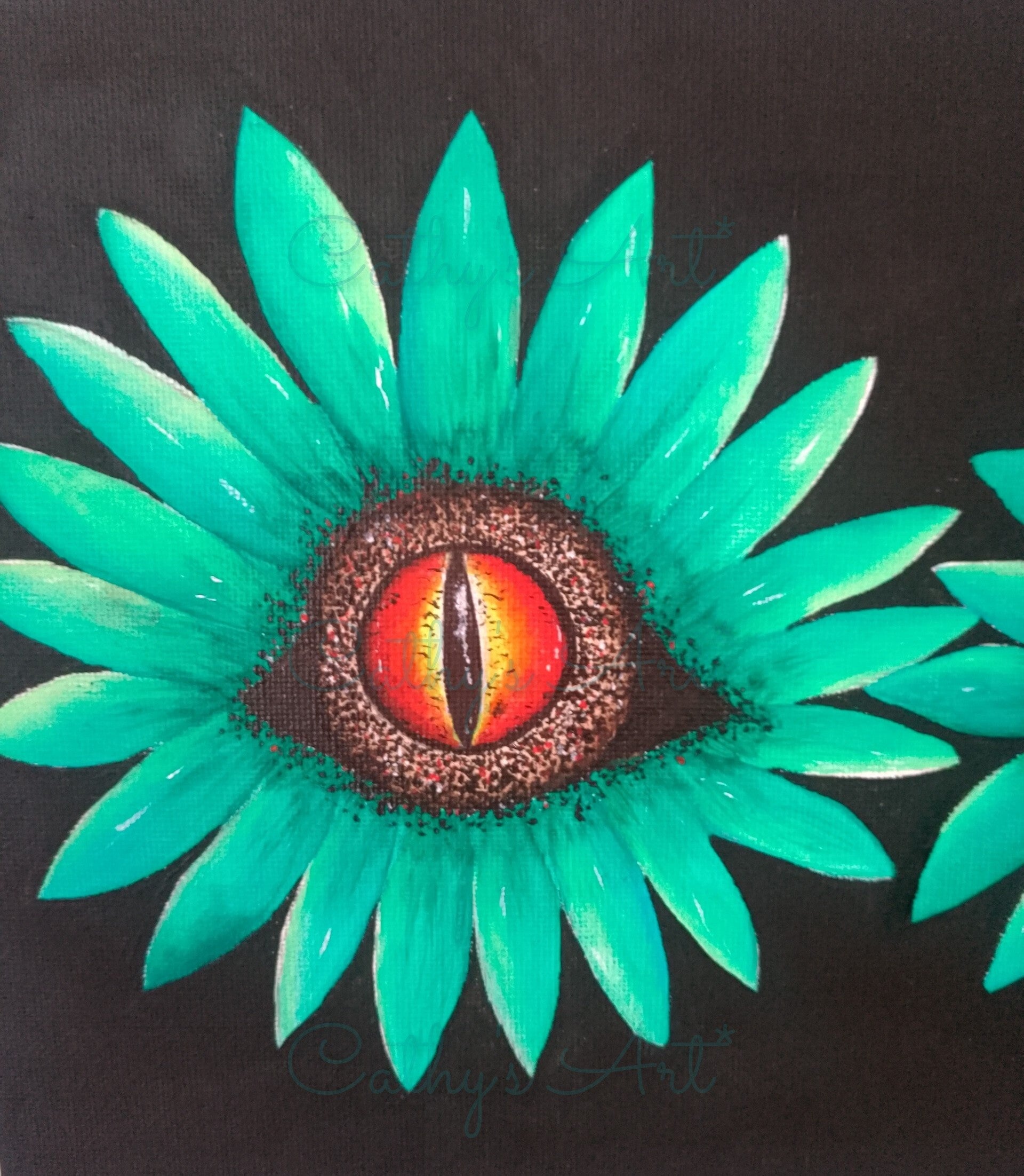 This painting is inspired by my love of flowers, using bold, bright green, turquoise tones to create the petals. As I wanted this piece to be dramatic I decided to paint the inner centres as Dragons Eyes. Using red, orange, yellow, white, black and brown tones for these. The background is painted black which really makes the subject stand out.