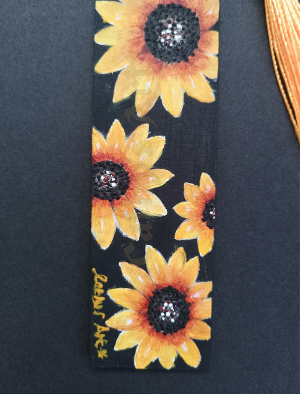 "Sunflowers"is an original acrylic painting on a plywood bookmark. Painted in tones of yellows, orange, rust, brown, black, and white. The background is matt black acrylic paint. I wanted a vibrant feel to this bookmark so added my favorite flowers the sunflower.