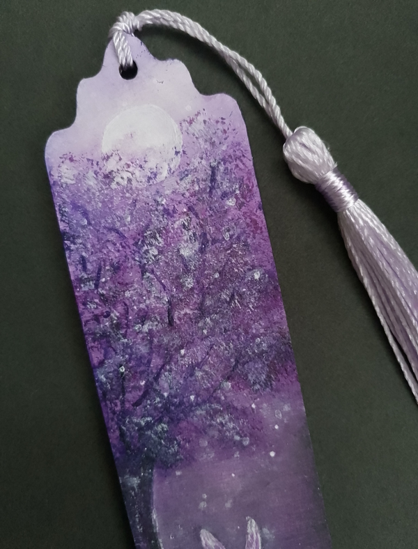 "The hare & the moon"is an original acrylic painting on a plywood bookmark. Painted in tones of purple, violet, lilac, grey and white. I have created a peaceful tranquil magical scene where the hare sits under the big purple tree and gazes at the moon.
