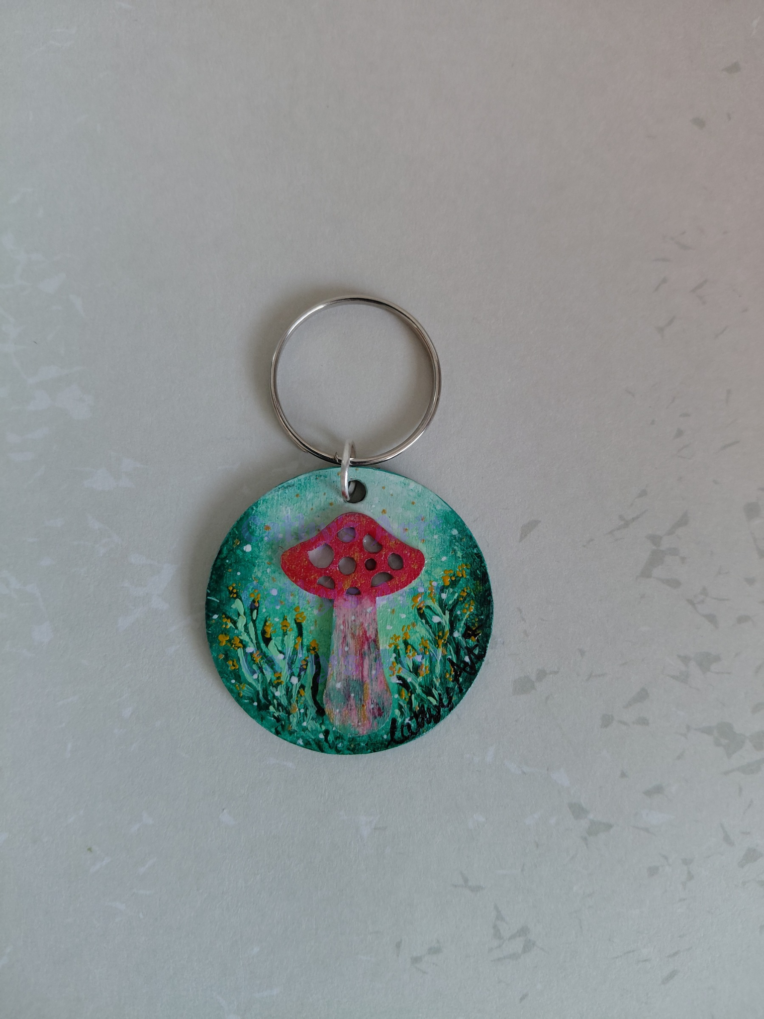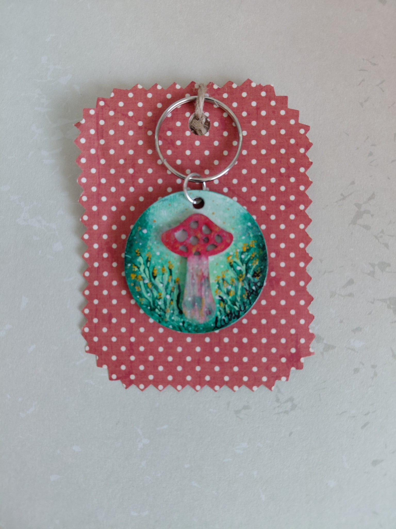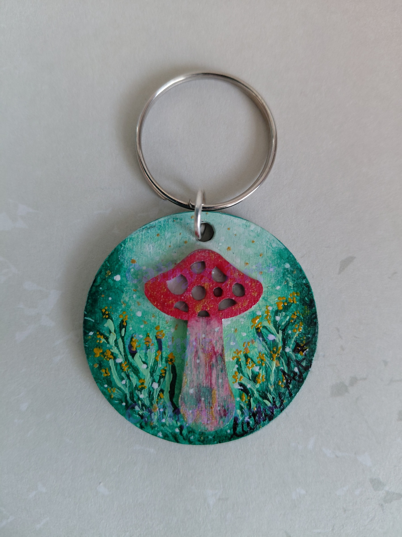 A magical little mushroom scene on a wooden round disc. Painted with acrylic paints in greens, white, yellow and red tones. I added a wooden mushroom which gives a 3D look and tiny yellow flowers. I finished off the painting with a subtle clear gloss proctection topcoat. And a 2.5 cm silver split ring to attach your keys.