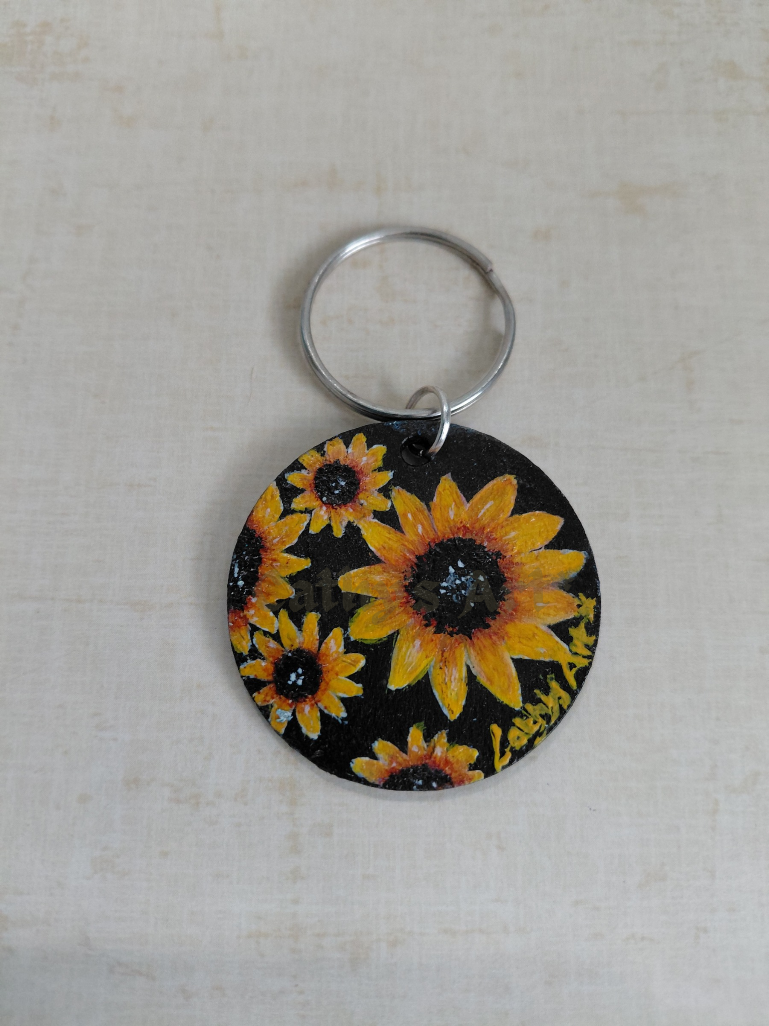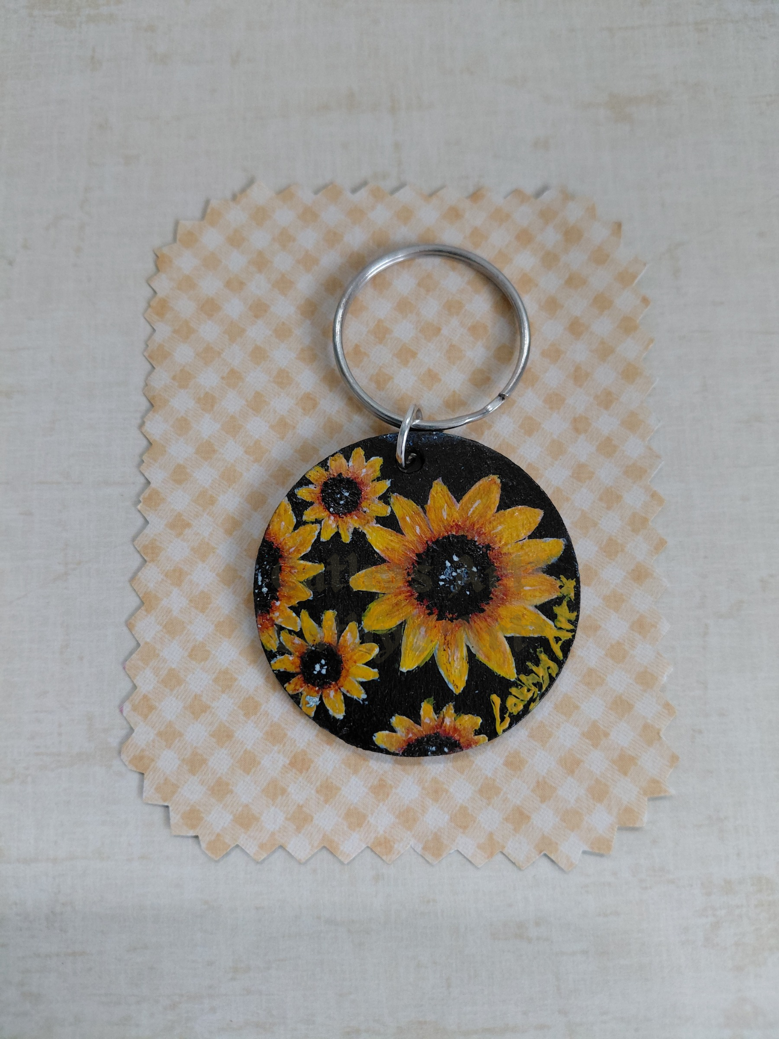A beautiful floral scene on a plywood round disc. Painted with acrylic paints in yellows, white, black, dark brown and rust tones. I wanted to create a bold striking scene with sunflowers. On a plain black background I have painted five sunflowers of different sizes. A simple yet striking design. I finished off the painting with a subtle clear gloss protection topcoat. And a 2.5 cm silver split ring to attach your keys.