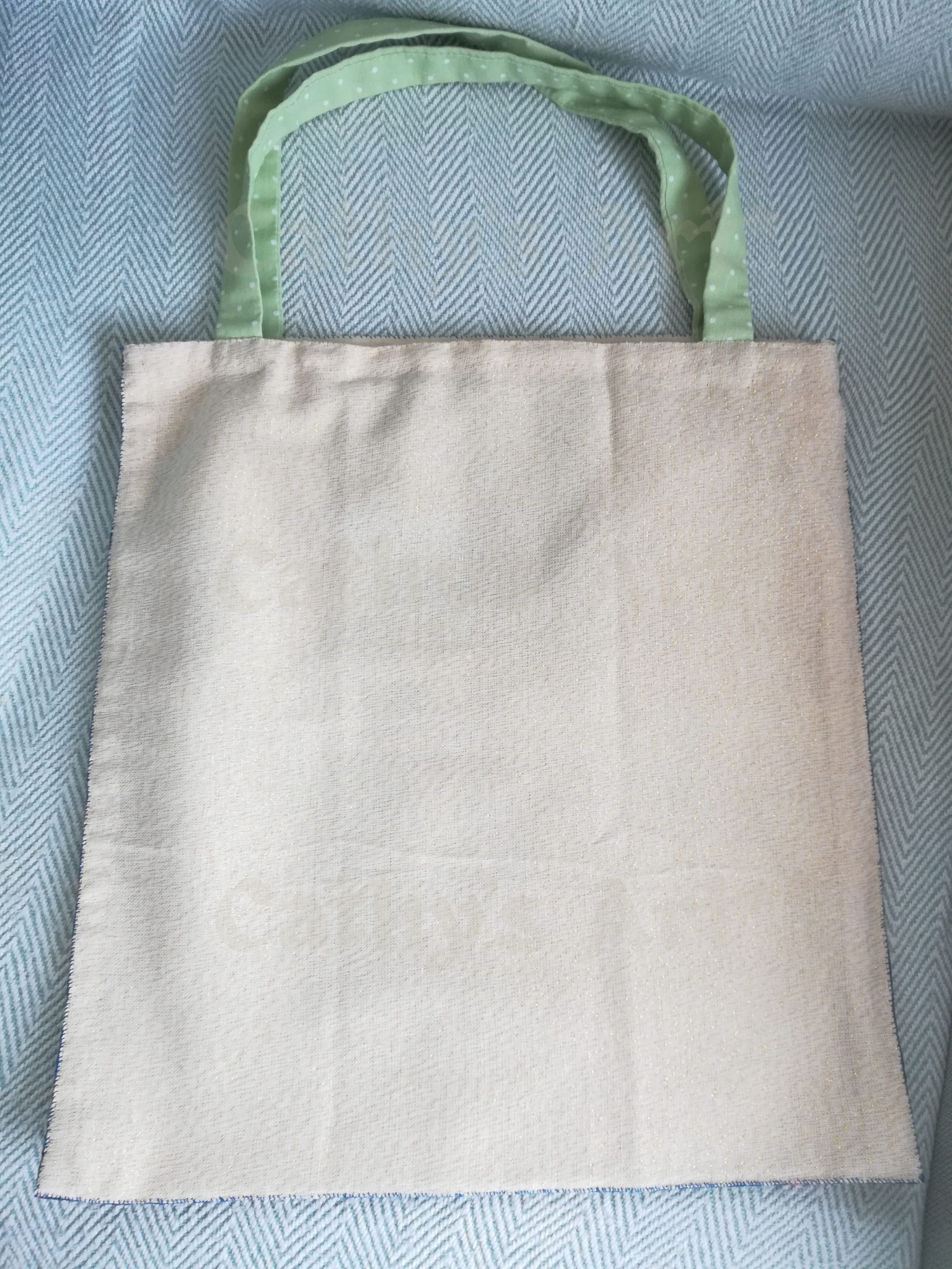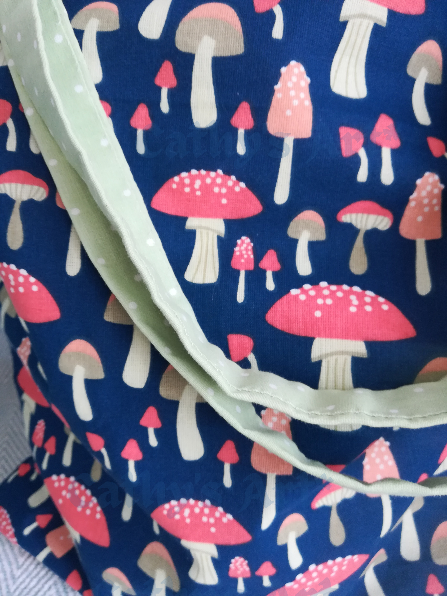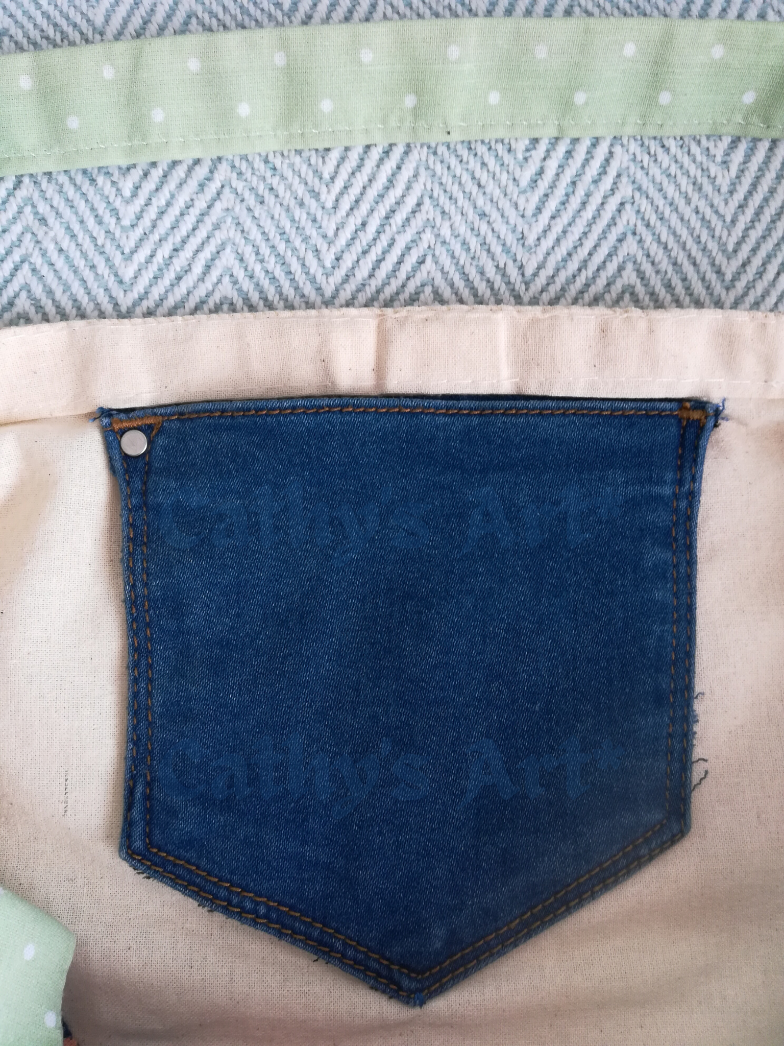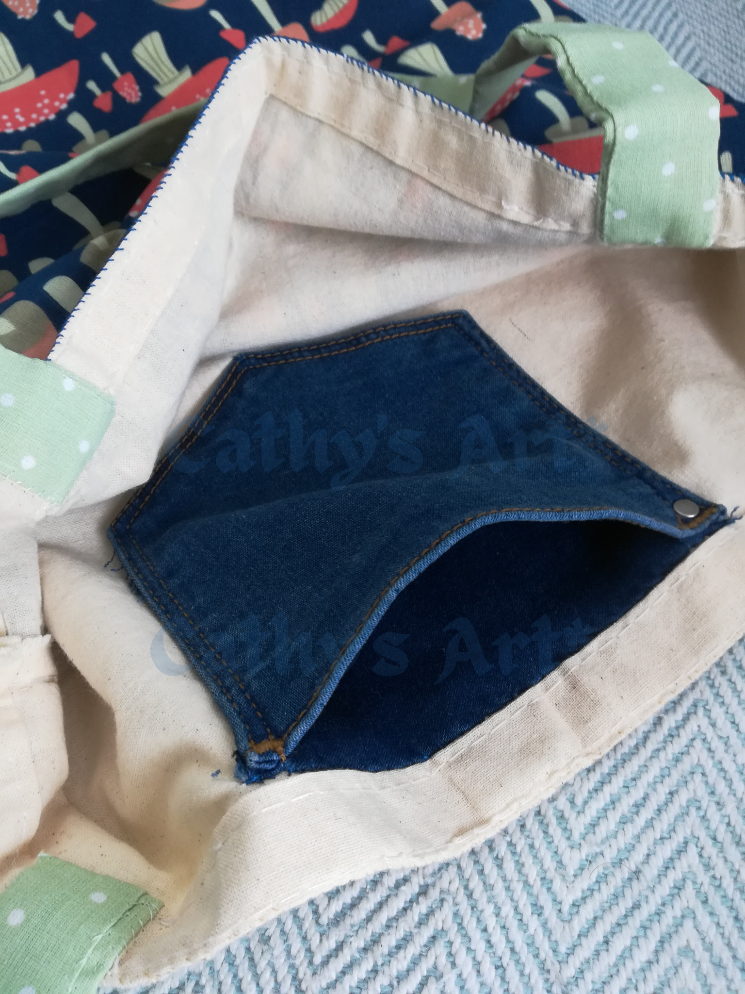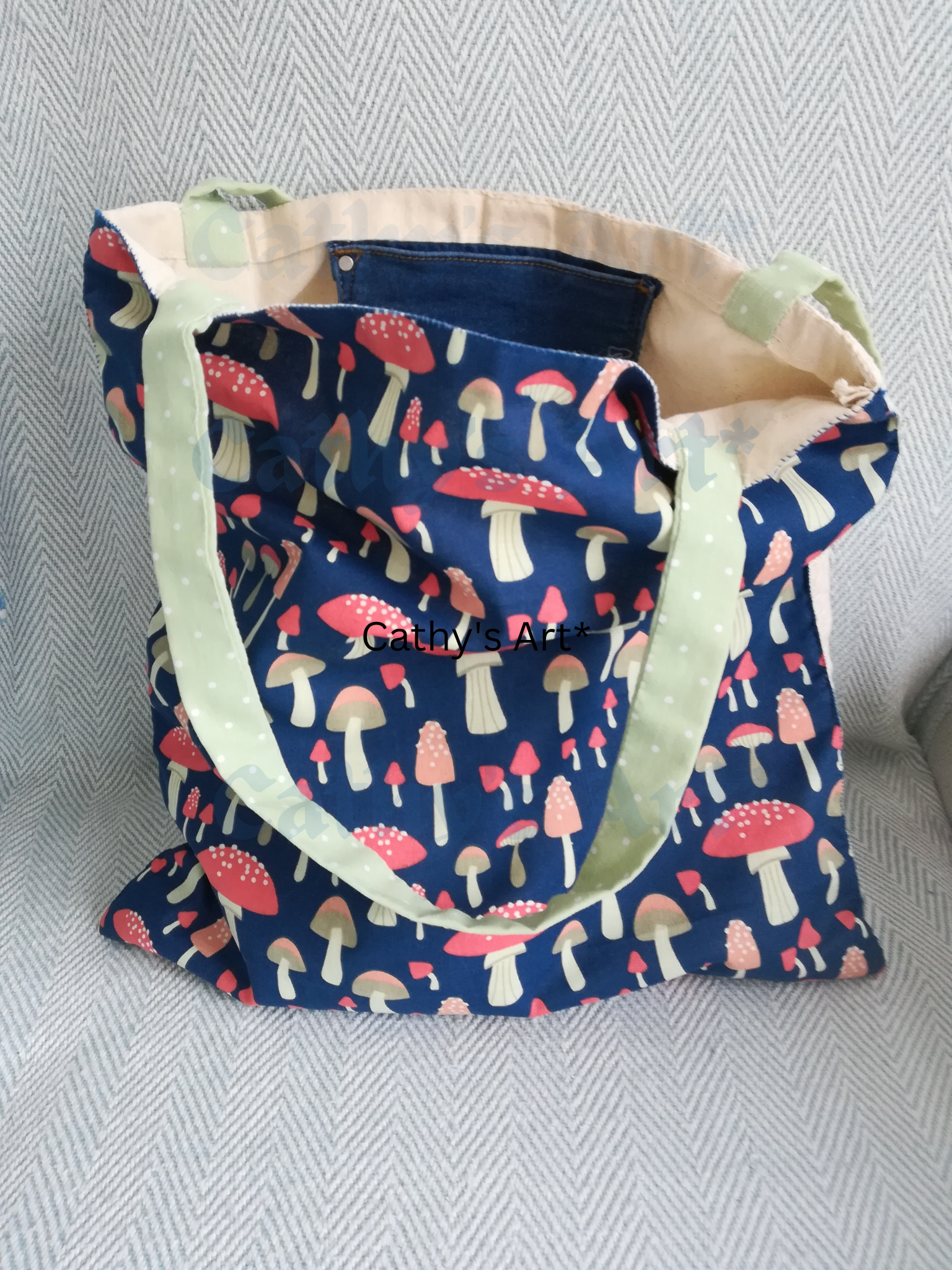 I love whimsical and had this gorgeous mushroom fabic, it has a blue background with pale green, coral red, peach and sage green mushrooms on it in various sizes. I attached the mushroom fabric to the front of the bag sewing by hand. I added a cream fabric with gold flecks to the back. A recycled blue denim pocket to the inside which is from a pair of denim jeggings. The straps are made with a pale green fabric with white spots. The inside of the bag is cream.