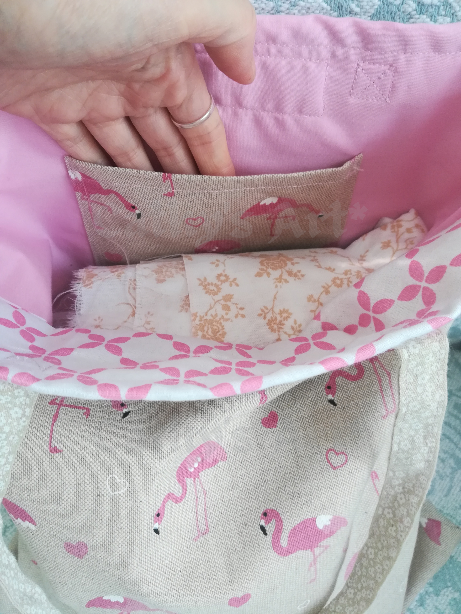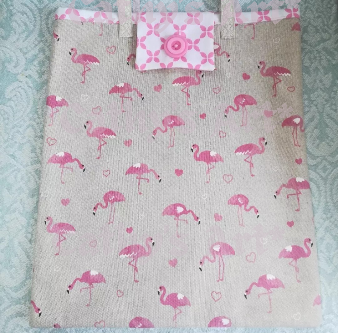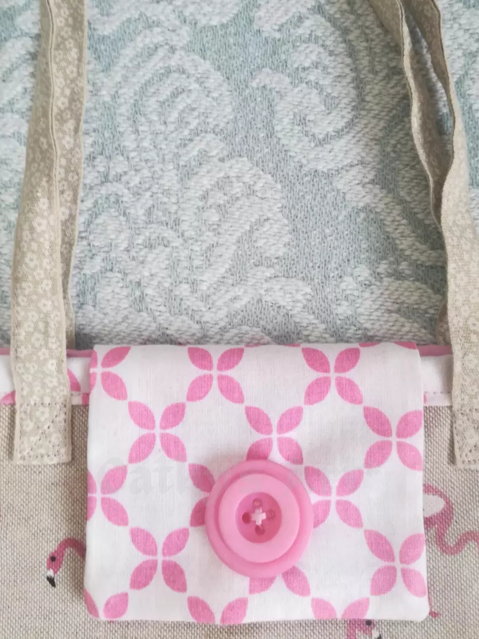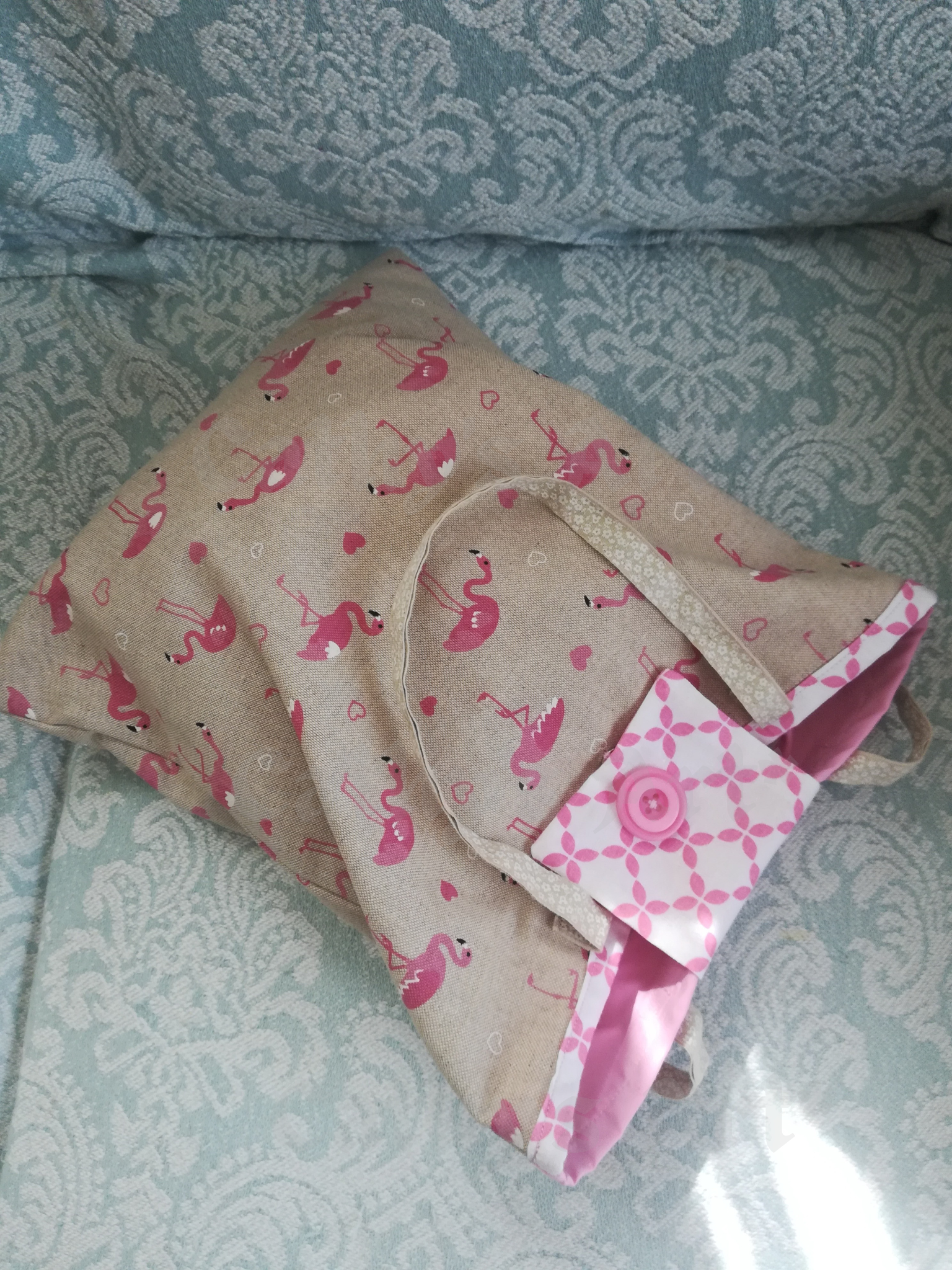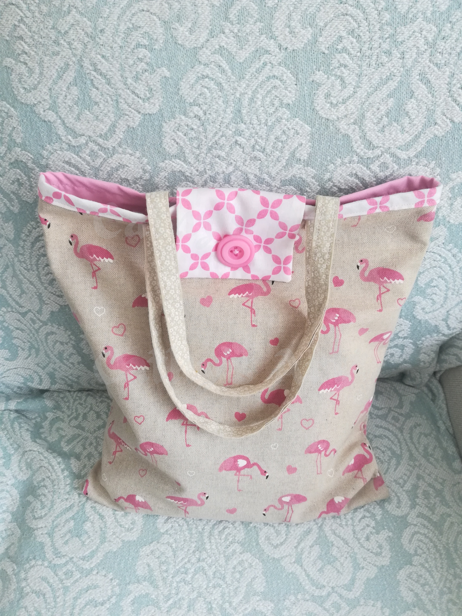 Lovely flamingo handmade bag. With a linen style beige fabric with pink flamingos and hearts. A white and pink pattern cotton fabric lining, flamingo fabric inside pocket, flowery beige and white handles, and a flap over press stud fastener with large pink button for decoration.