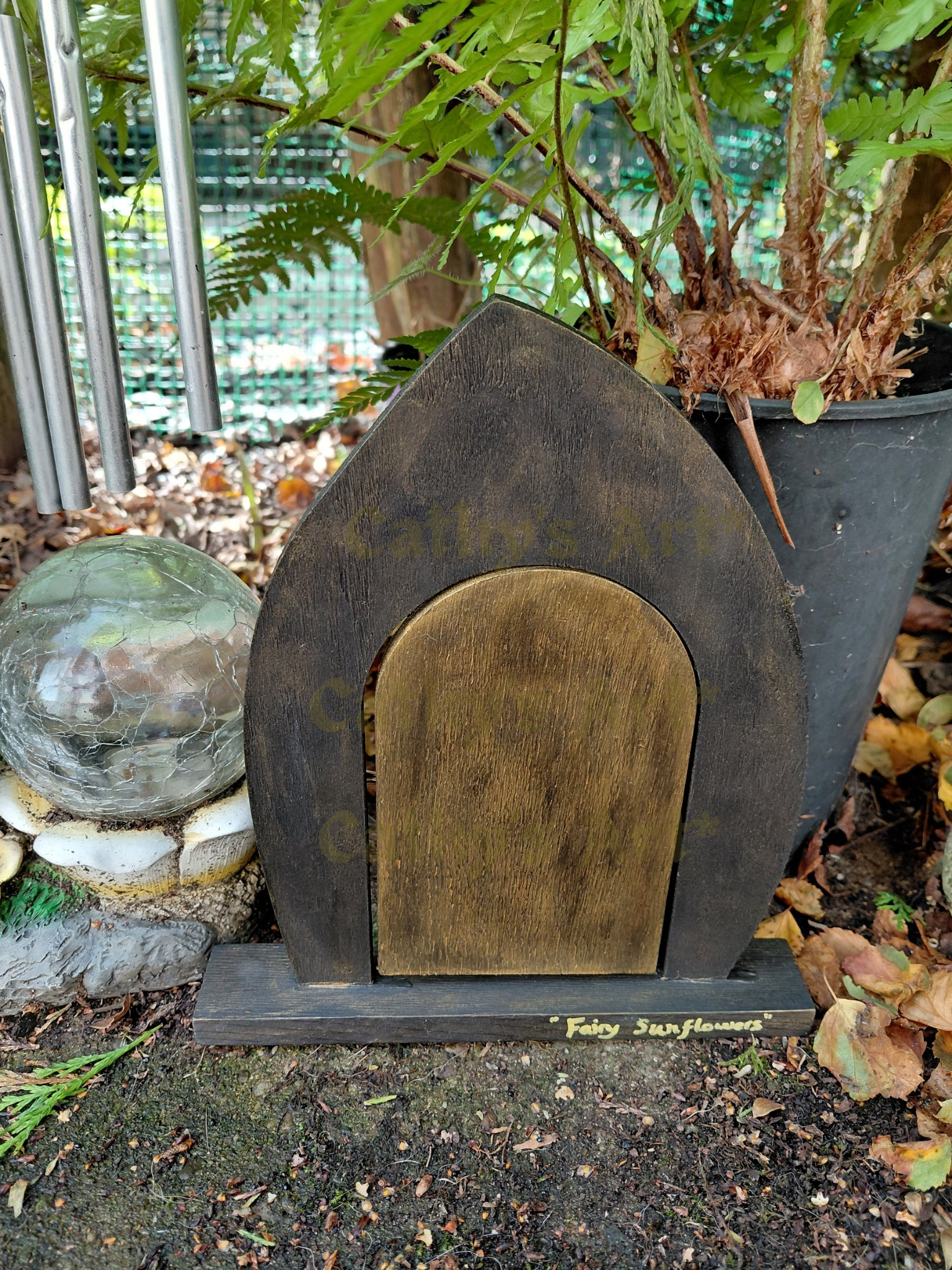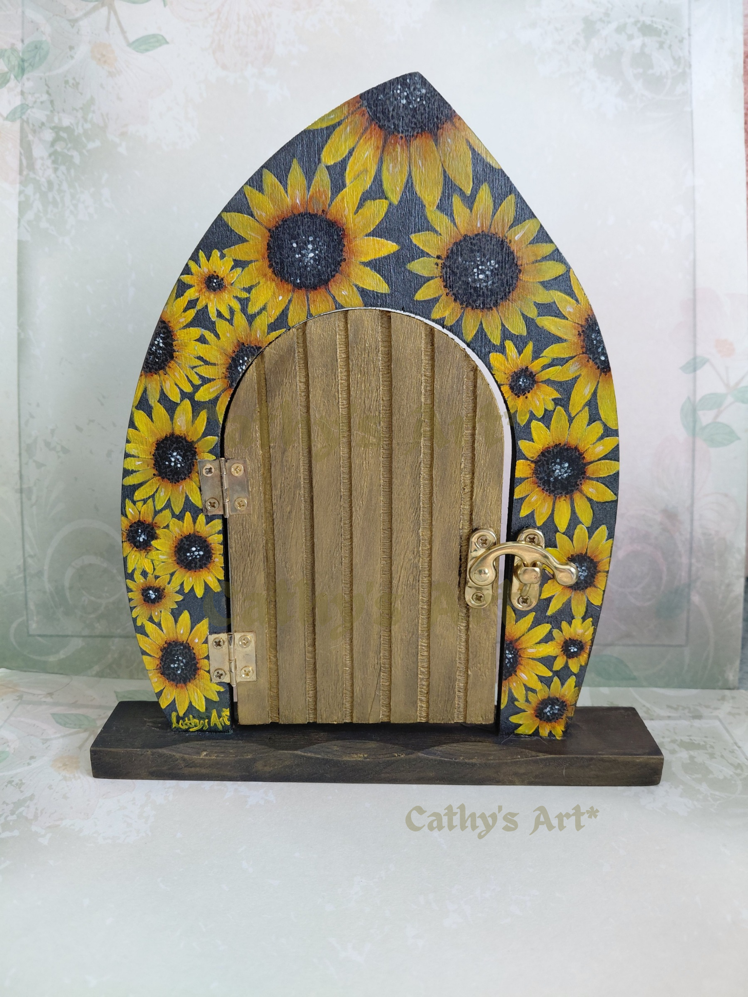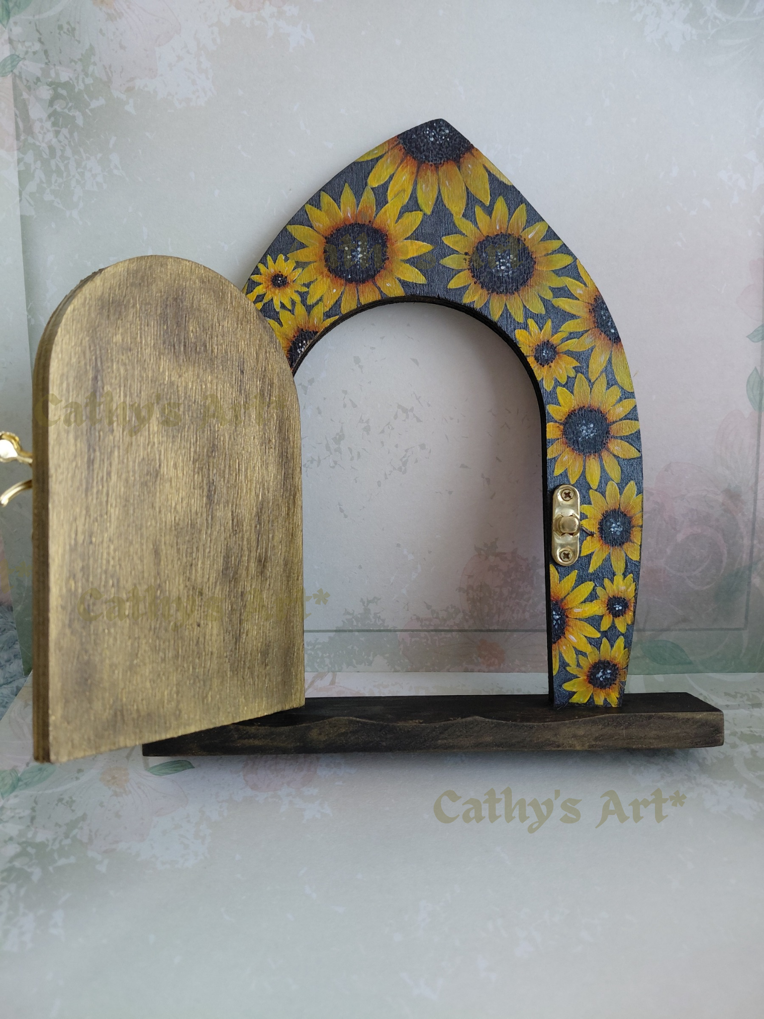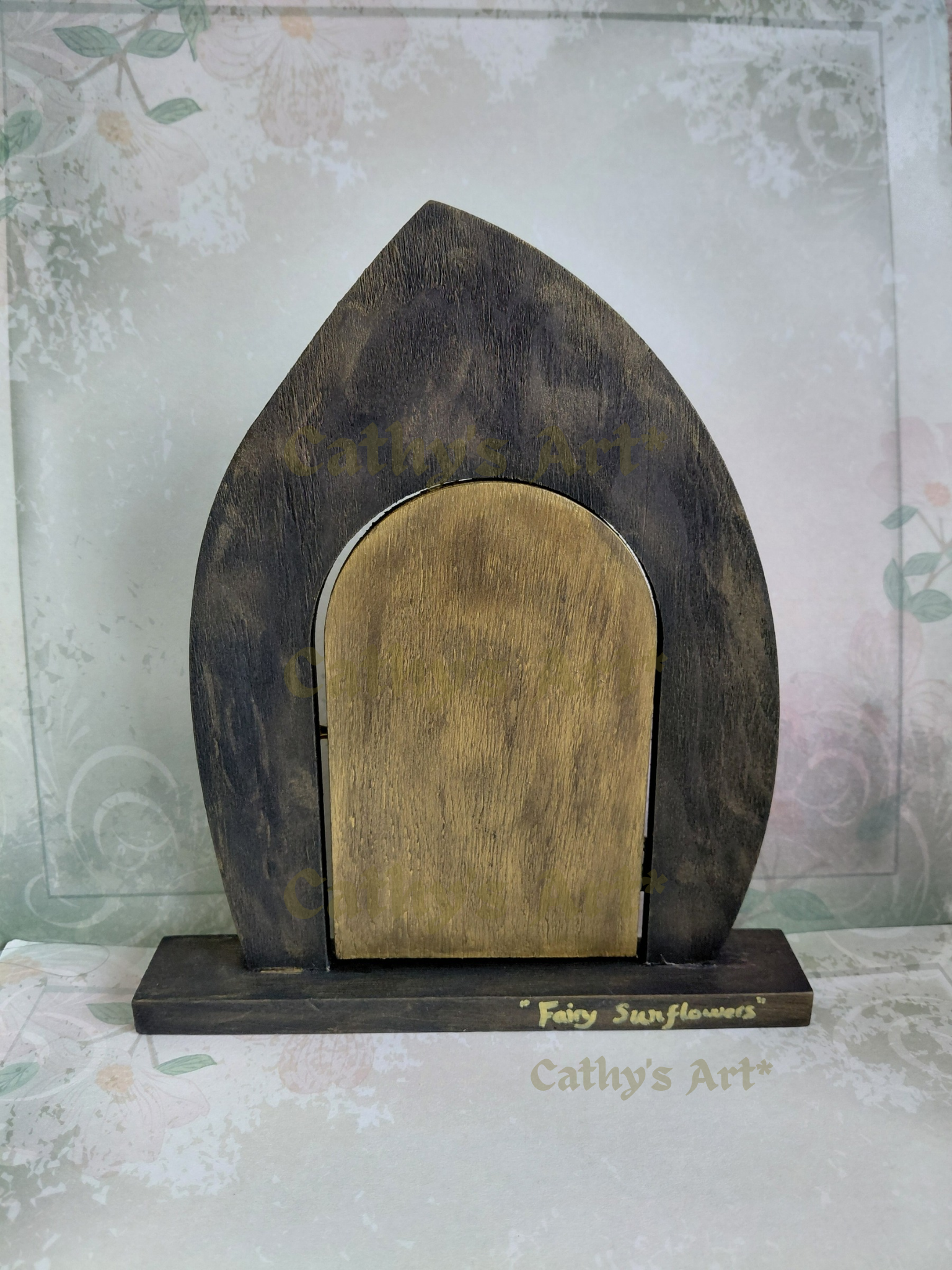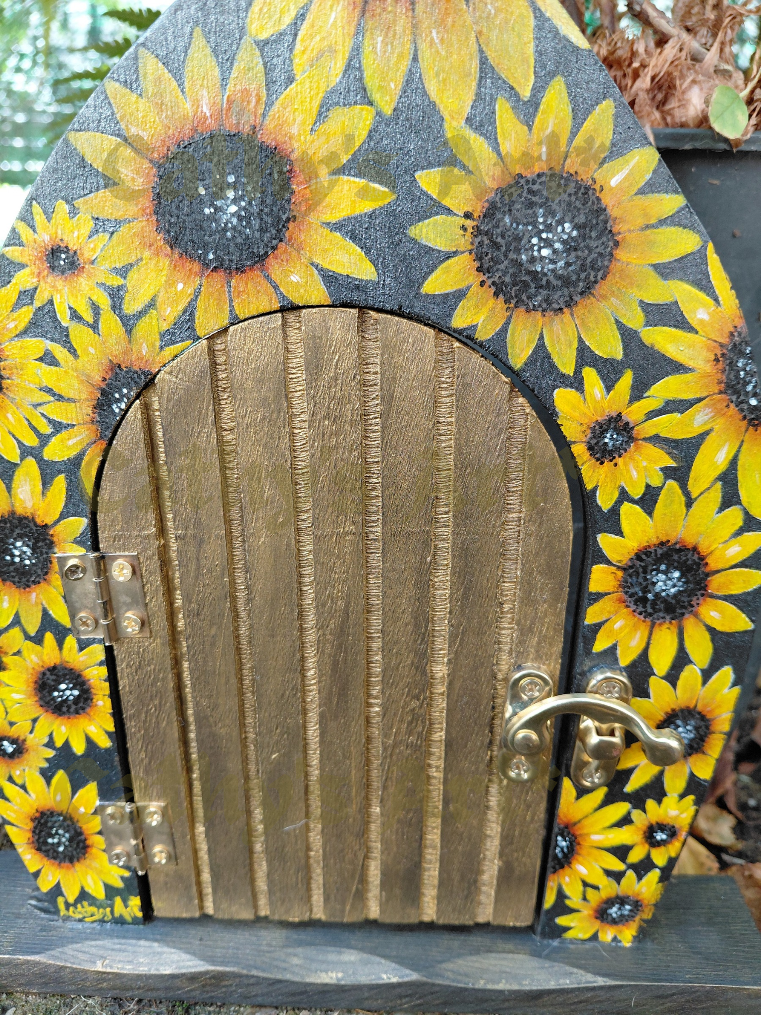 A beautiful original piece of art on a wooden fairy door, for all you fairy lovers, fairy door collectors, art collectors and sunflower enthusiasts.