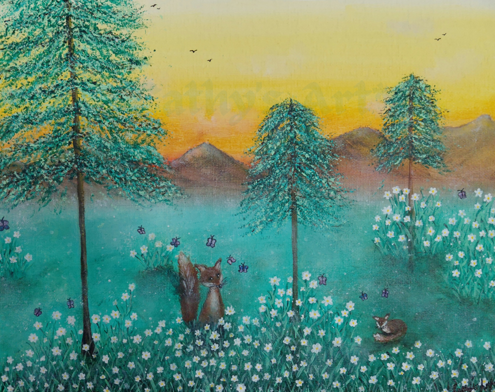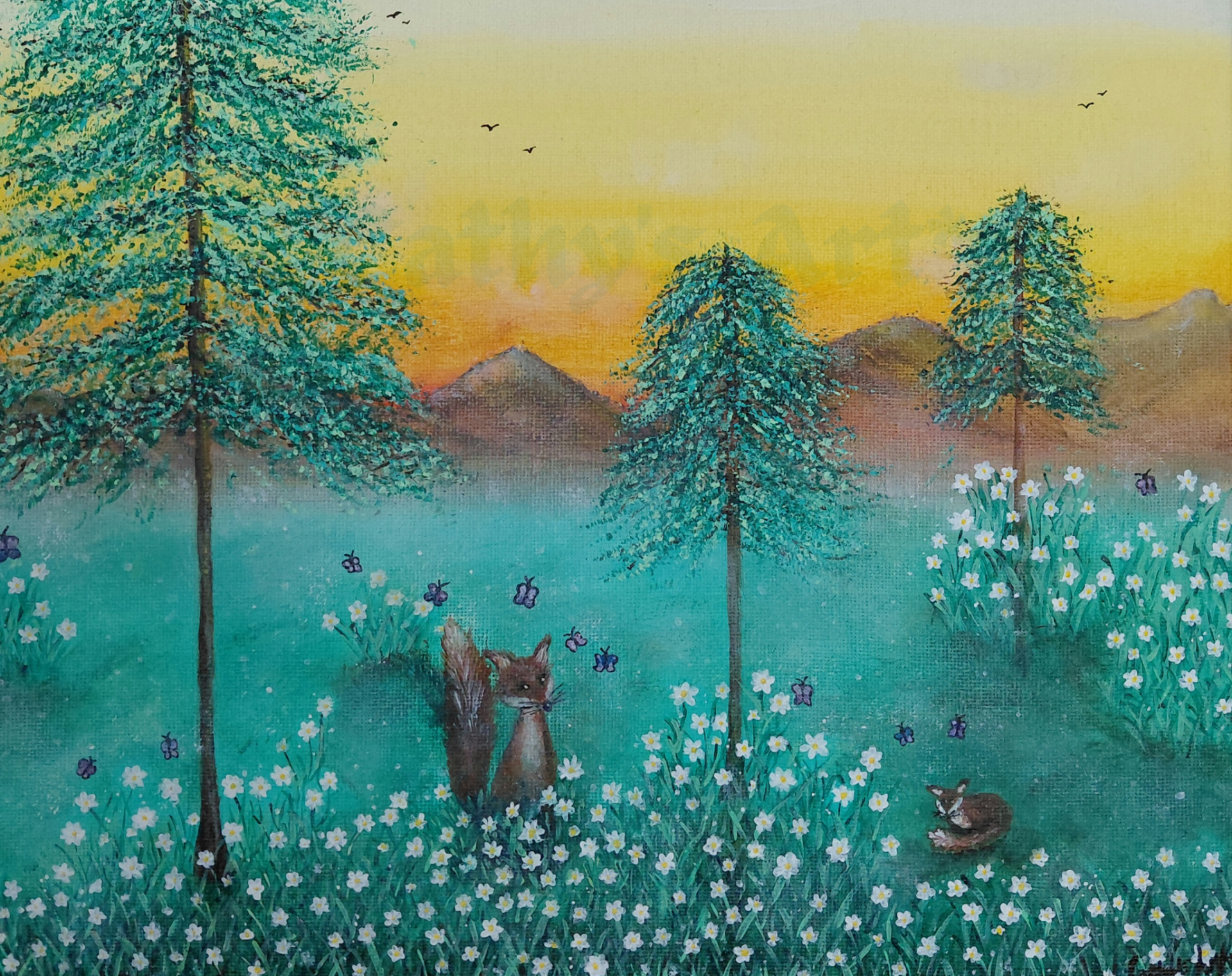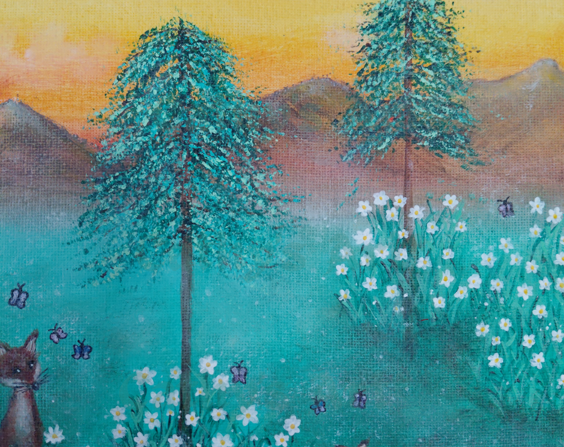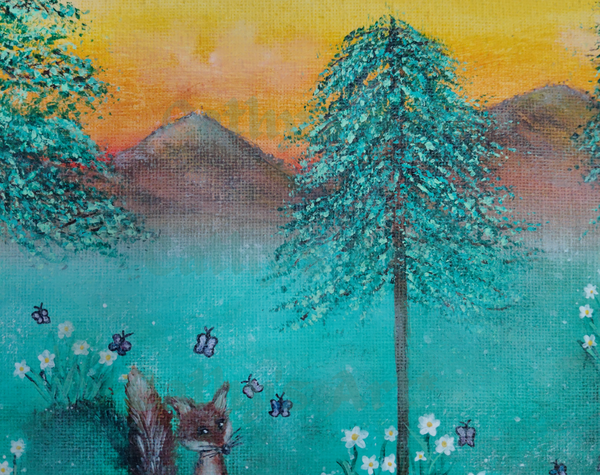 I wanted to create a blissful summers evening sunset scene in tones of yellows, and oranges for the sky, green trees, lots of white flowers, purple and lilac butterflies and a mother fox and her cub sit amongst the flowers. Birds fly high in the distance in this enchanting scene.