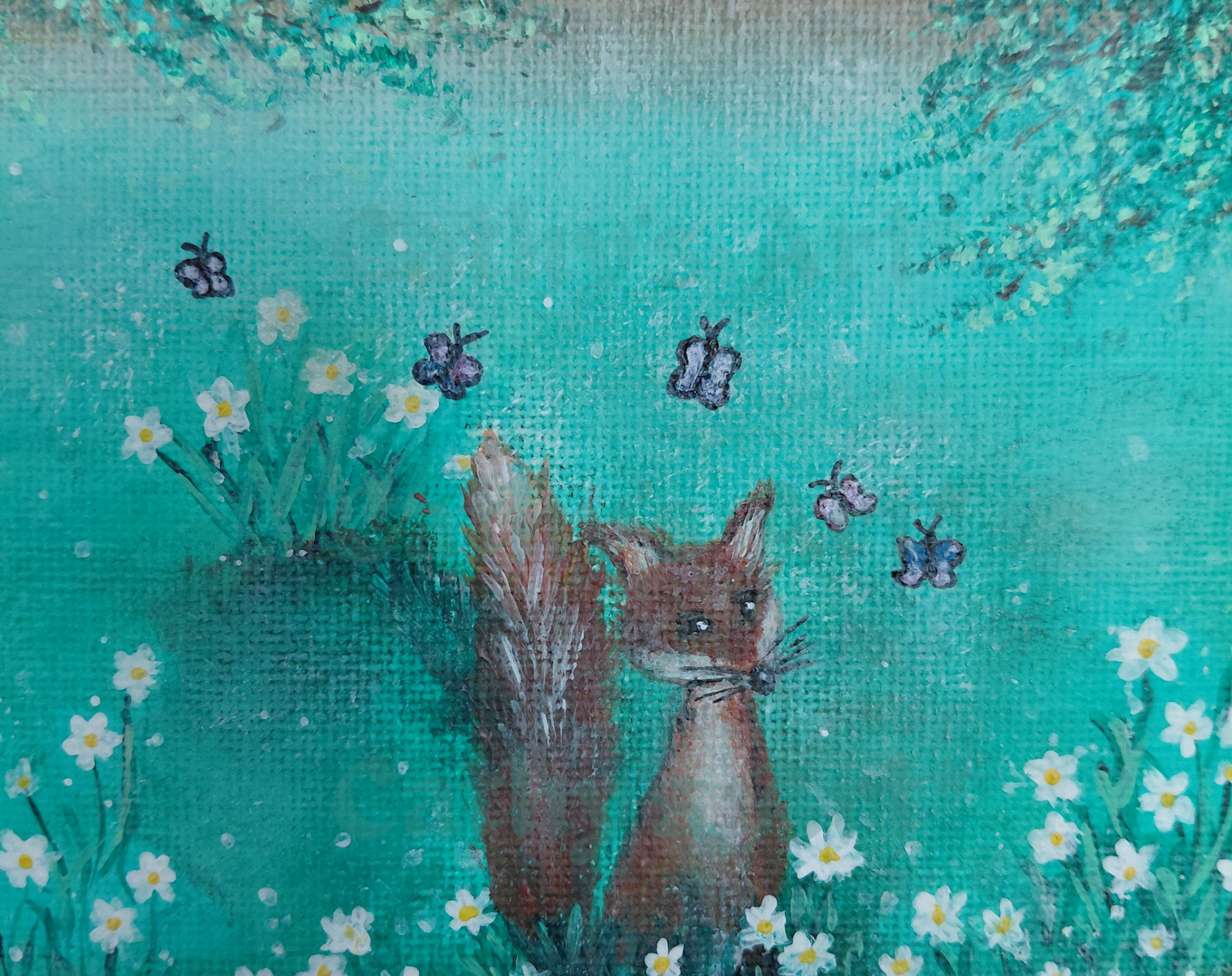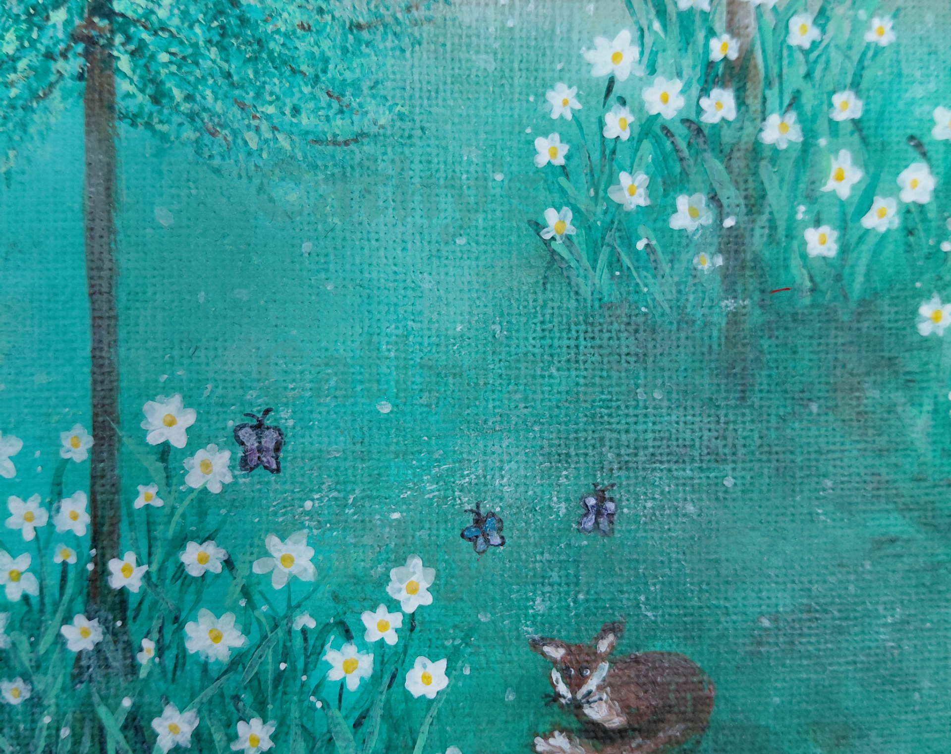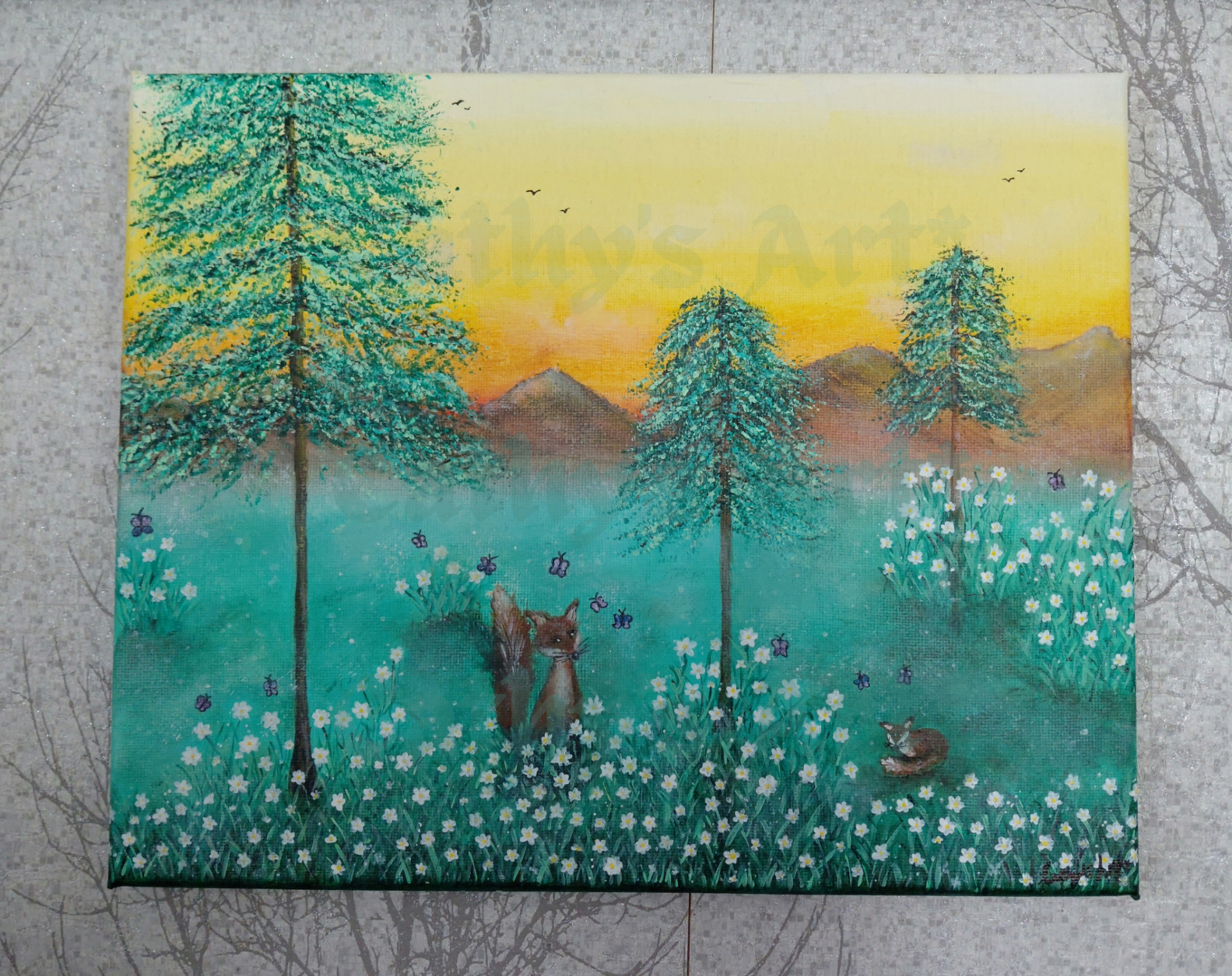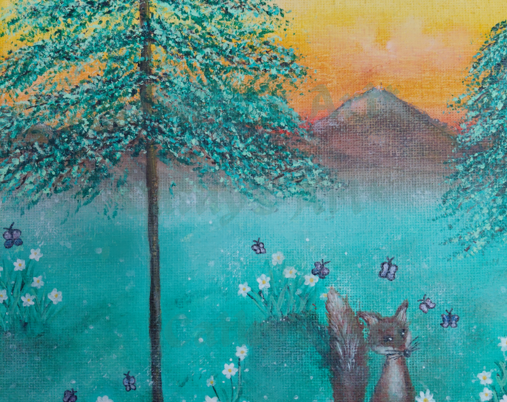 I wanted to create a blissful summers evening sunset scene in tones of yellows, and oranges for the sky, green trees, lots of white flowers, purple and lilac butterflies and a mother fox and her cub sit amongst the flowers. Birds fly high in the distance in this enchanting scene.