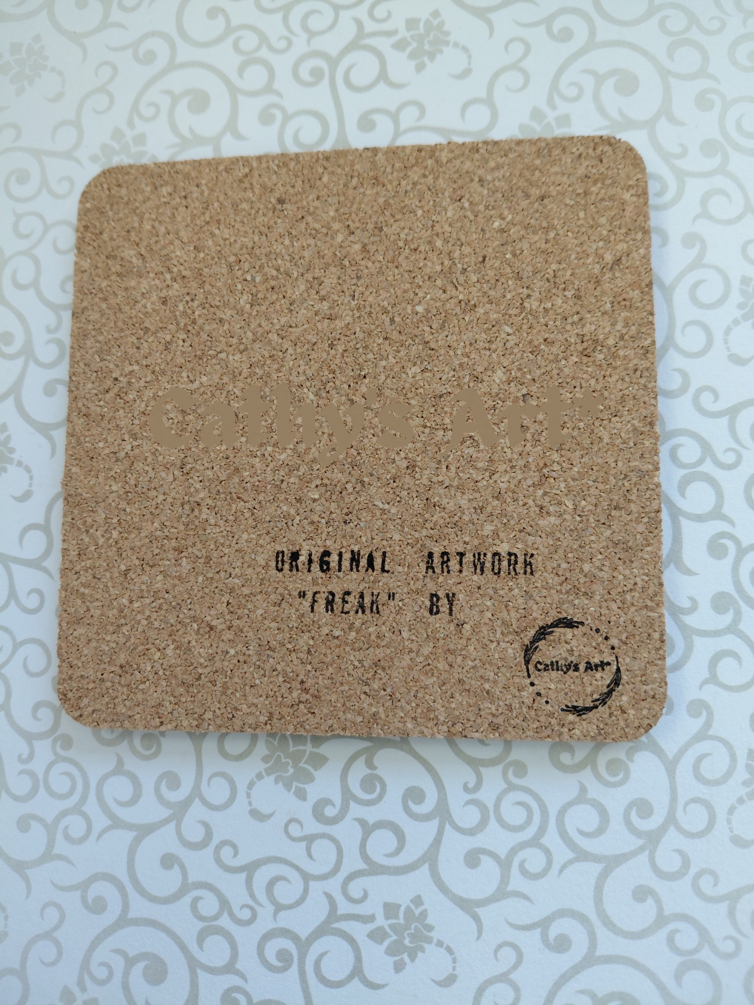The coasters are substainably-sourced eucalyptus hardboard, with a non-slip cork base. They are a heat, moisture and UV-resistant vinyl print measuring 10 x 10 cm. Made and printed in the UK.