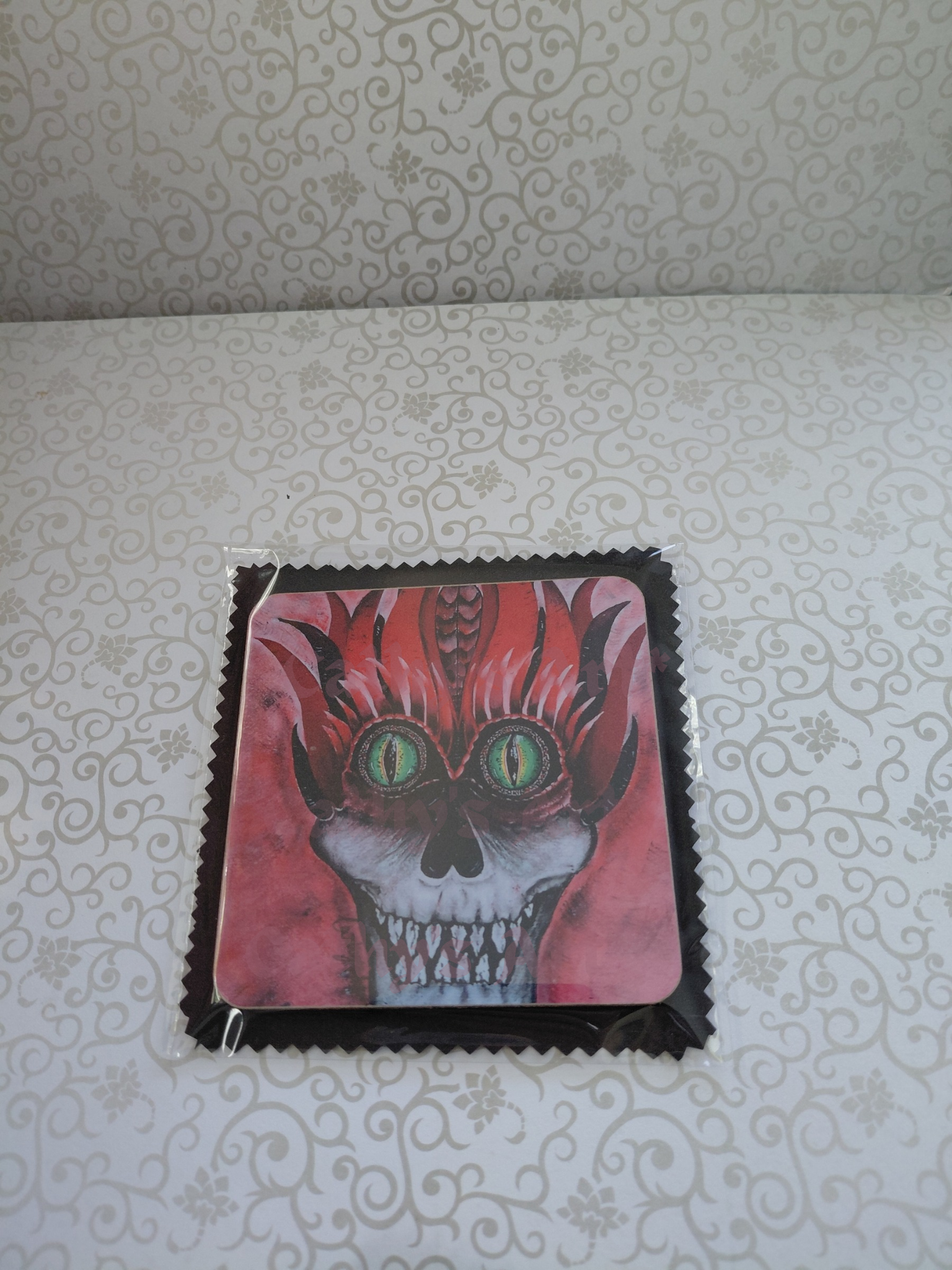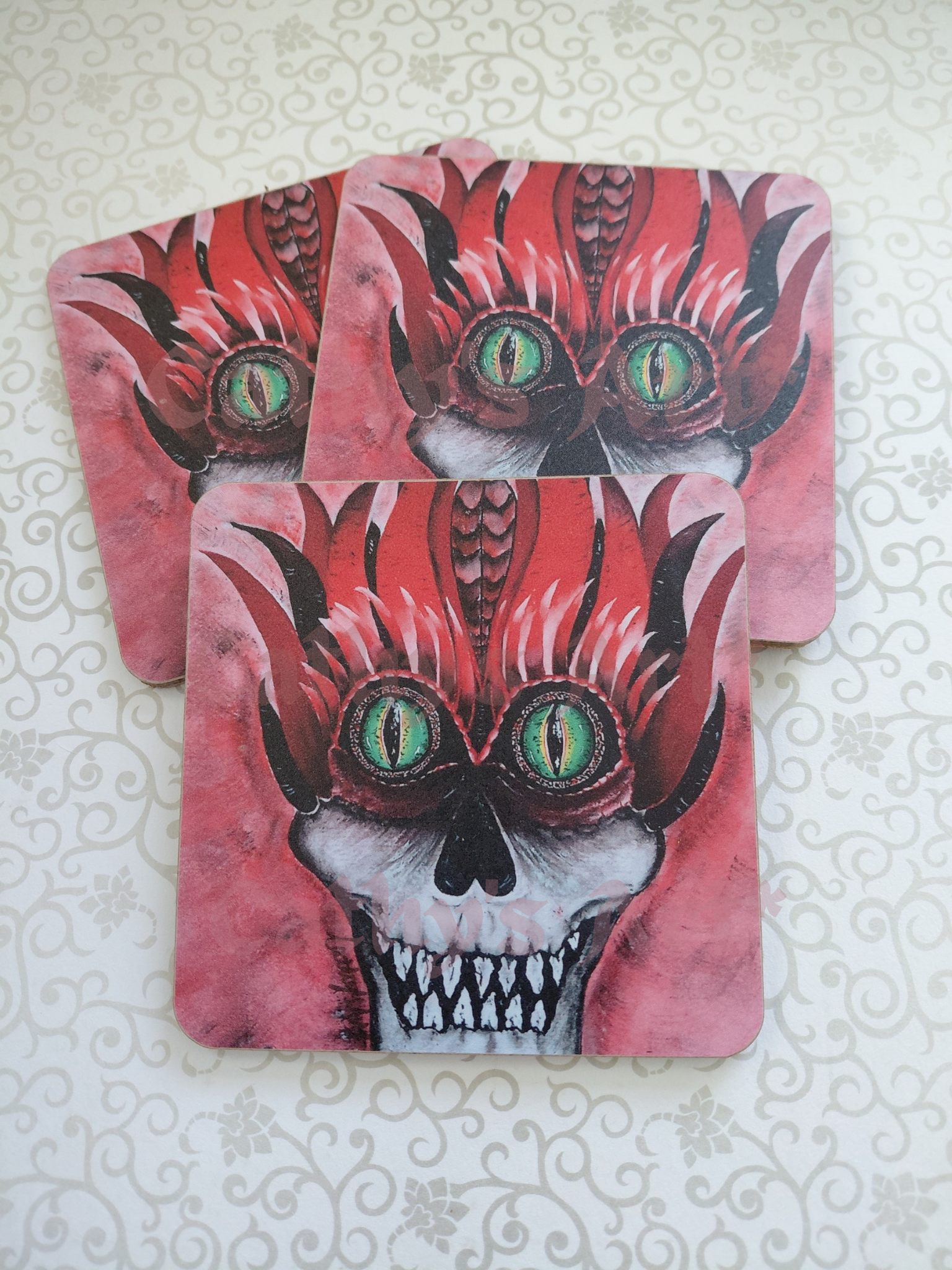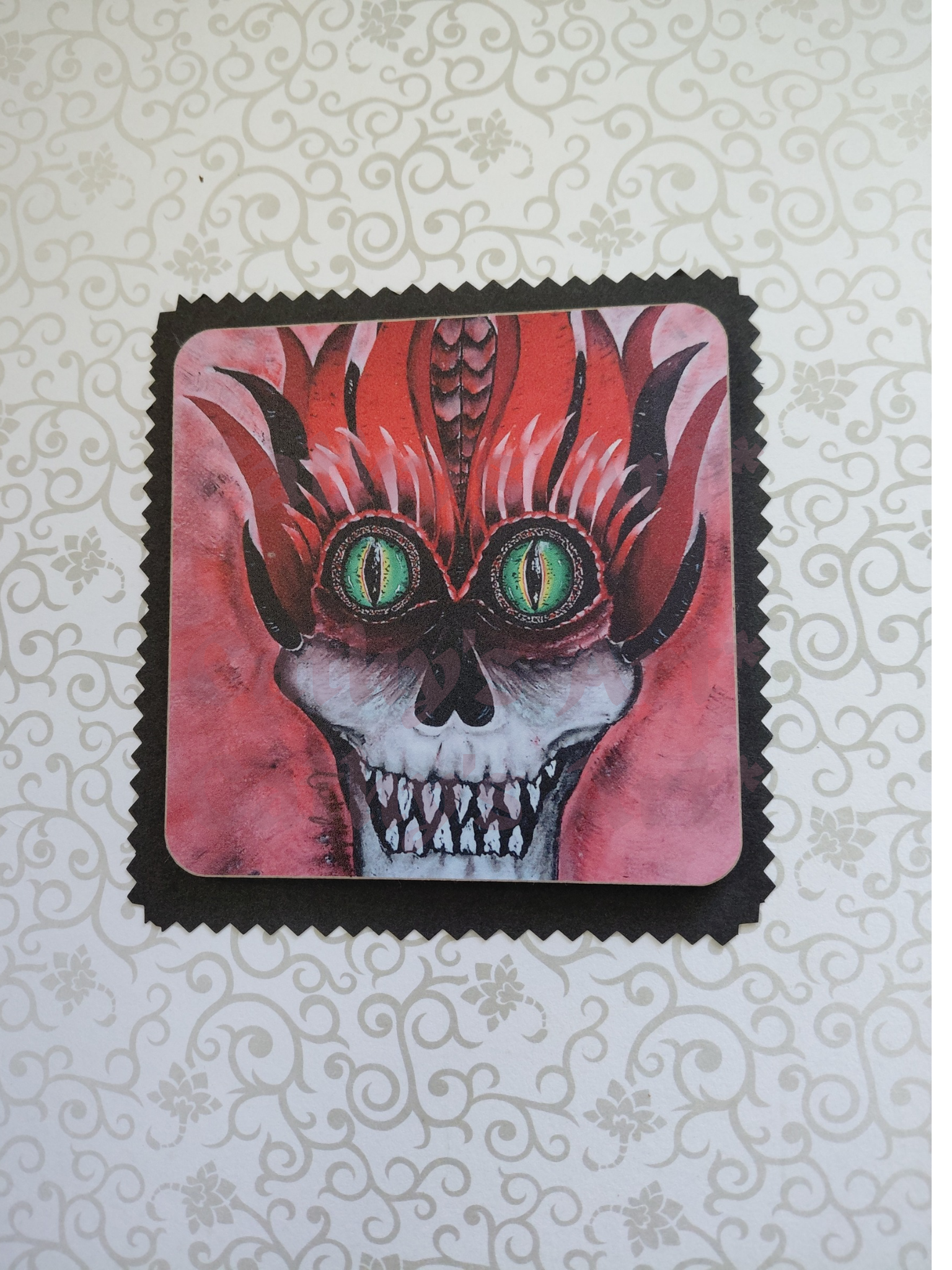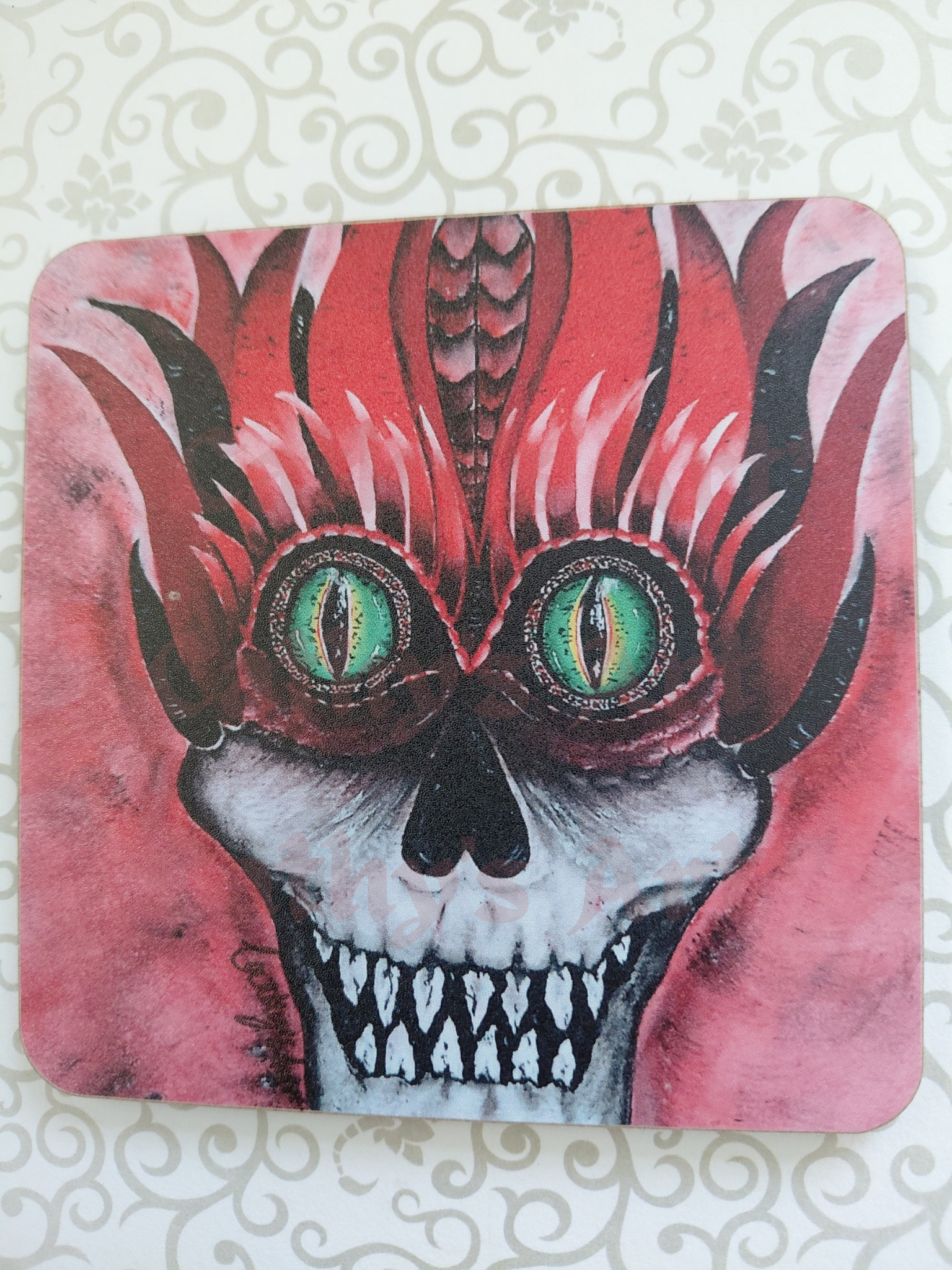 "Freak" is an original acrylic painting on acrylic paper. Painted in colours of reds, black, yellow, green, grey and white. Freak is a mixture of a skull and dragon from my imagination.