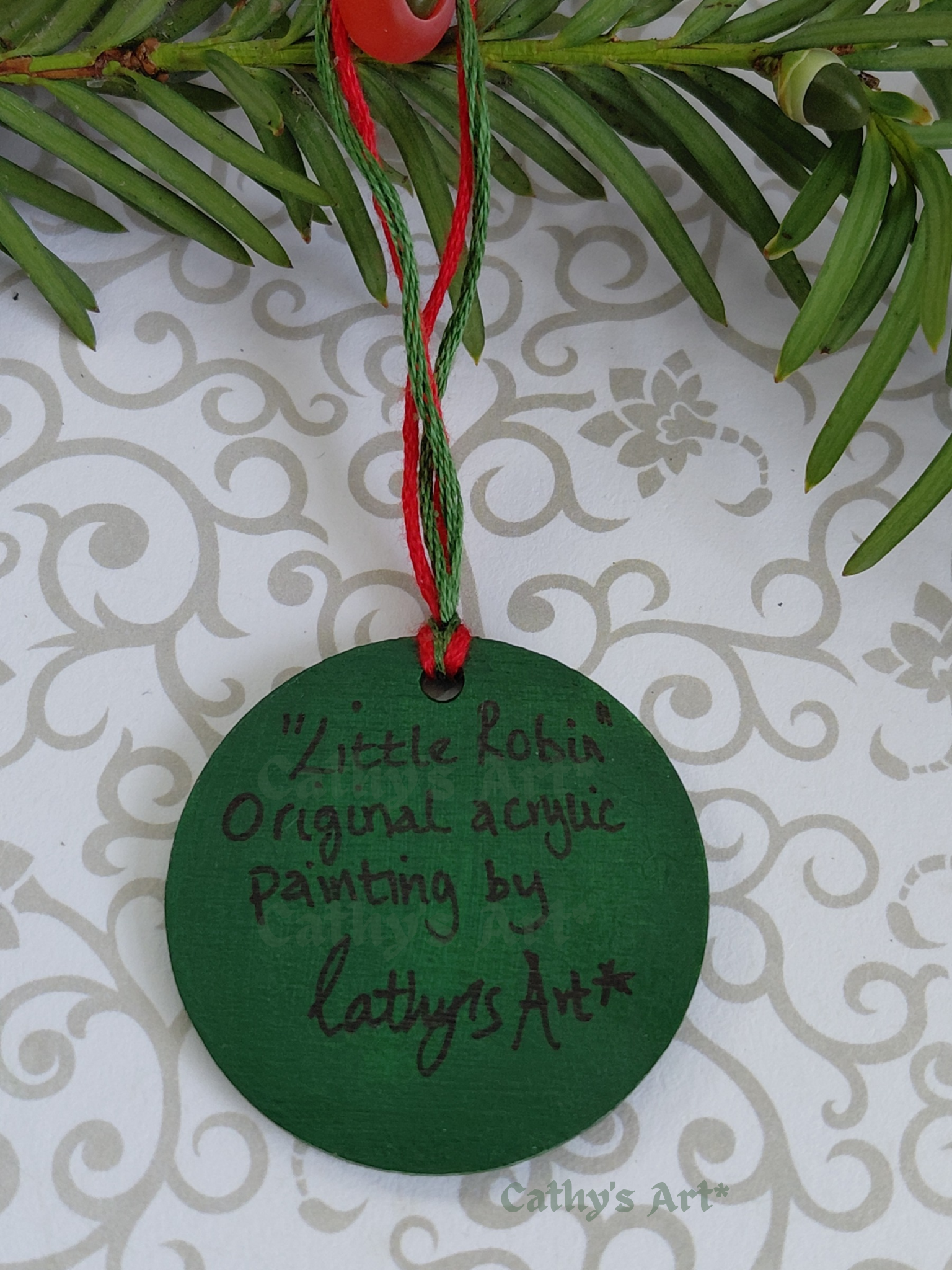 "Little Robin" is an original acrylic mini painting on a plywood disc. A beauitful decoration for your Christmas Tree. In tones of greens, red, brown, black and white. I have painted a little winter scene where the little robin sits on a tree branch, surrounded by the falling snow, cascading foliage and red berries. The disc has a subtle gloss top coat to give protection to the painting and a light sheen.