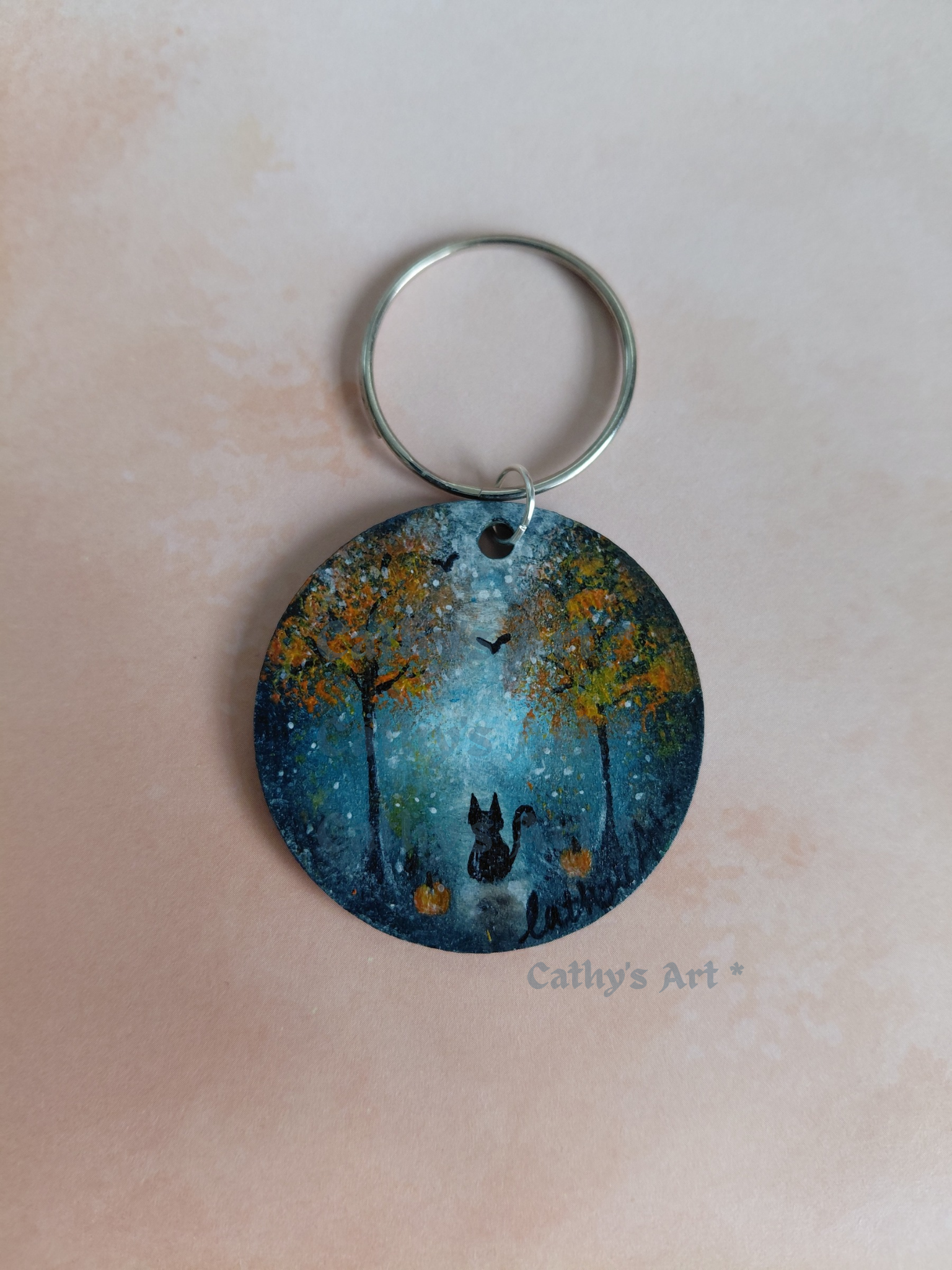 I love Halloween and wanted to create one of my magical minature paintings. The painting is on a wooden round disc. Painted with acrylic paints in black, oranges, white and prussian blue. I have painted a moonlit misty atmosphere with orange coloured trees against the dark murky background where light shines down from the moon. A black cat sits amongst the pumpkins on the path and black crows fly above. Dancing orbs glow in the air. I finished off the painting with a subtle clear gloss proctection topcoat. And a 2.5 cm silver split ring to attach your keys.