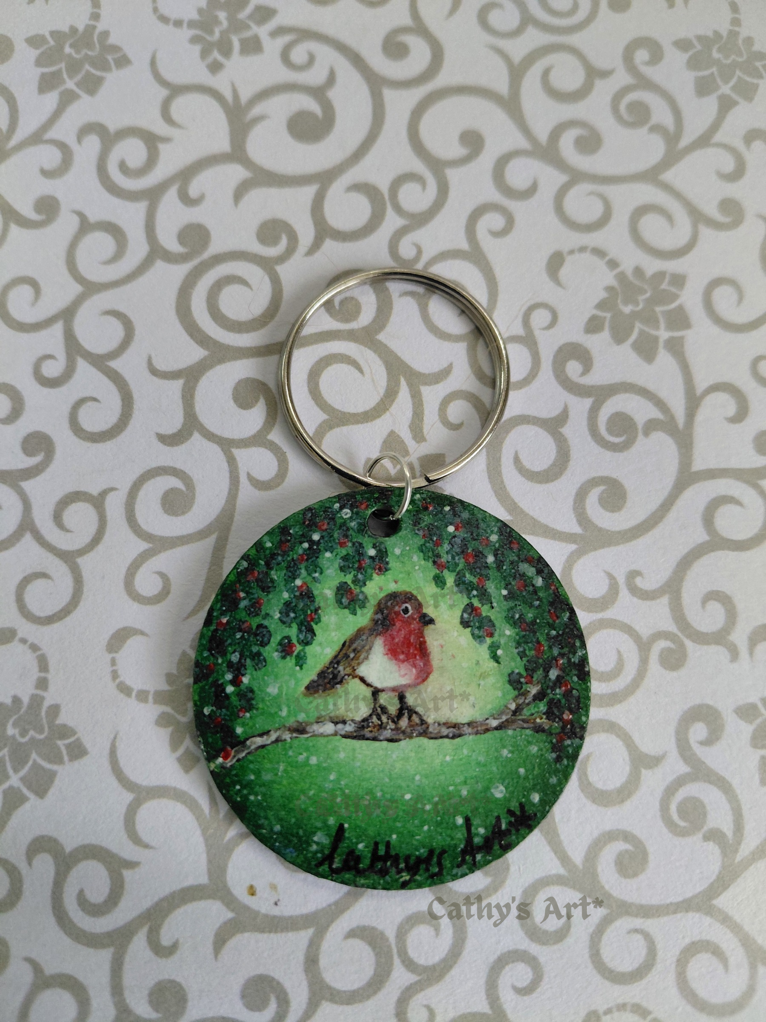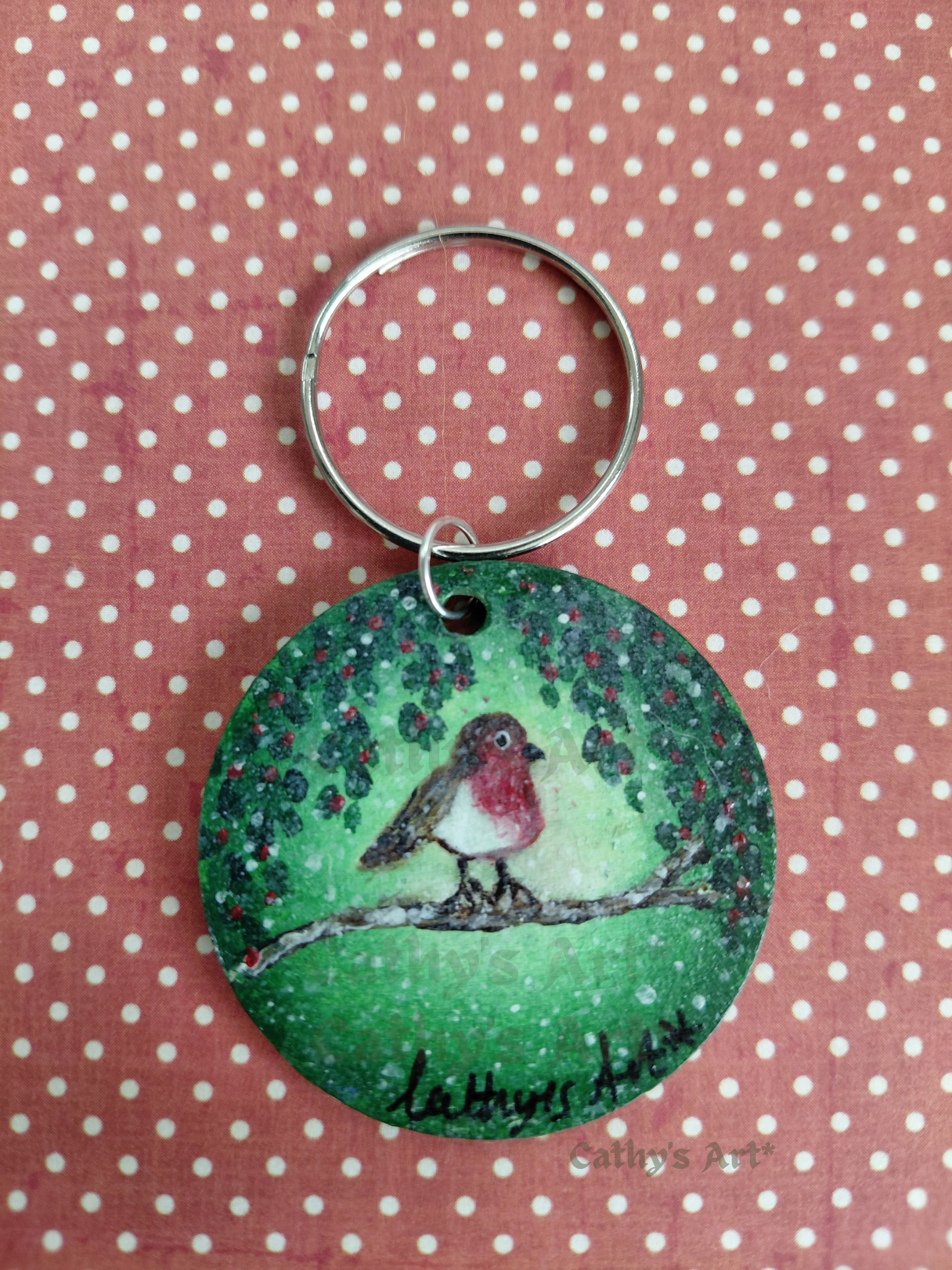 Little Robin" is an original acrylic mini painting on a plywood disc. I have made this one as a keyring. In tones of greens, red, brown, black and white. I have painted a little winter scene where the little robin sits on a tree branch, surrounded by the falling snow, cascading foliage and red berries. The disc has a subtle gloss top coat to give protection to the painting and a light sheen. And a 2.5 cm silver split ring to attach to your keys. The disc measures 3.7 cm x 3.7