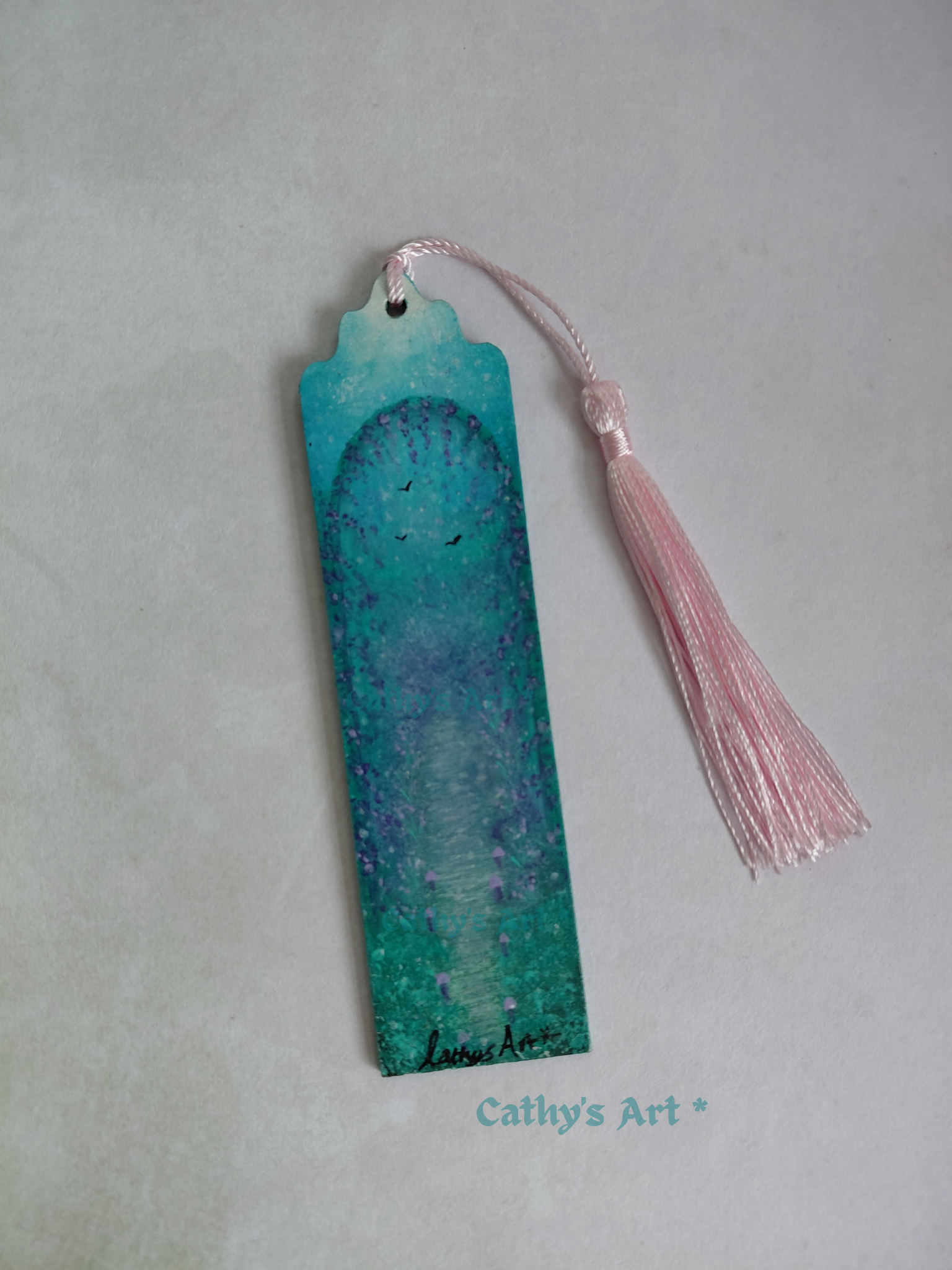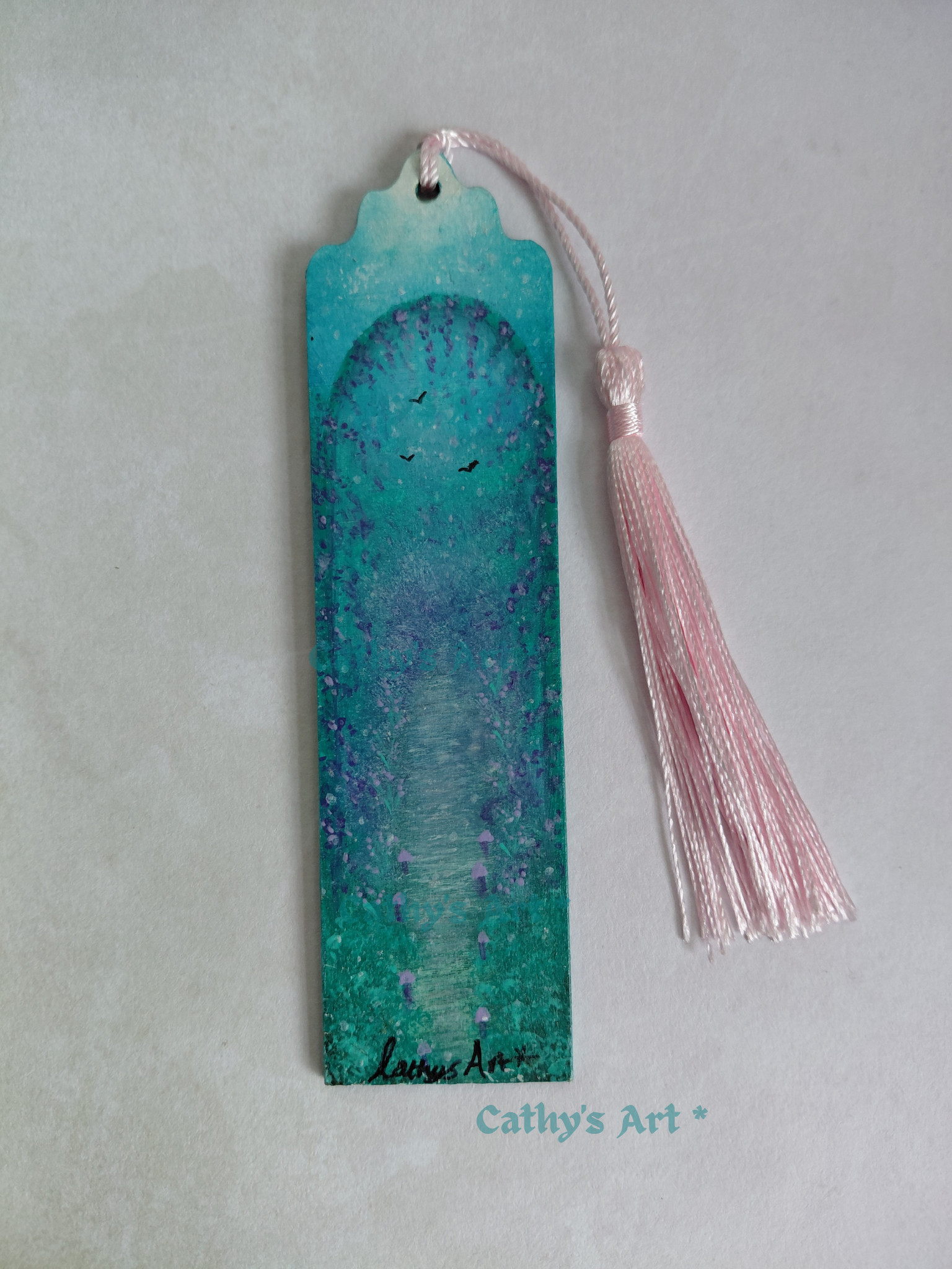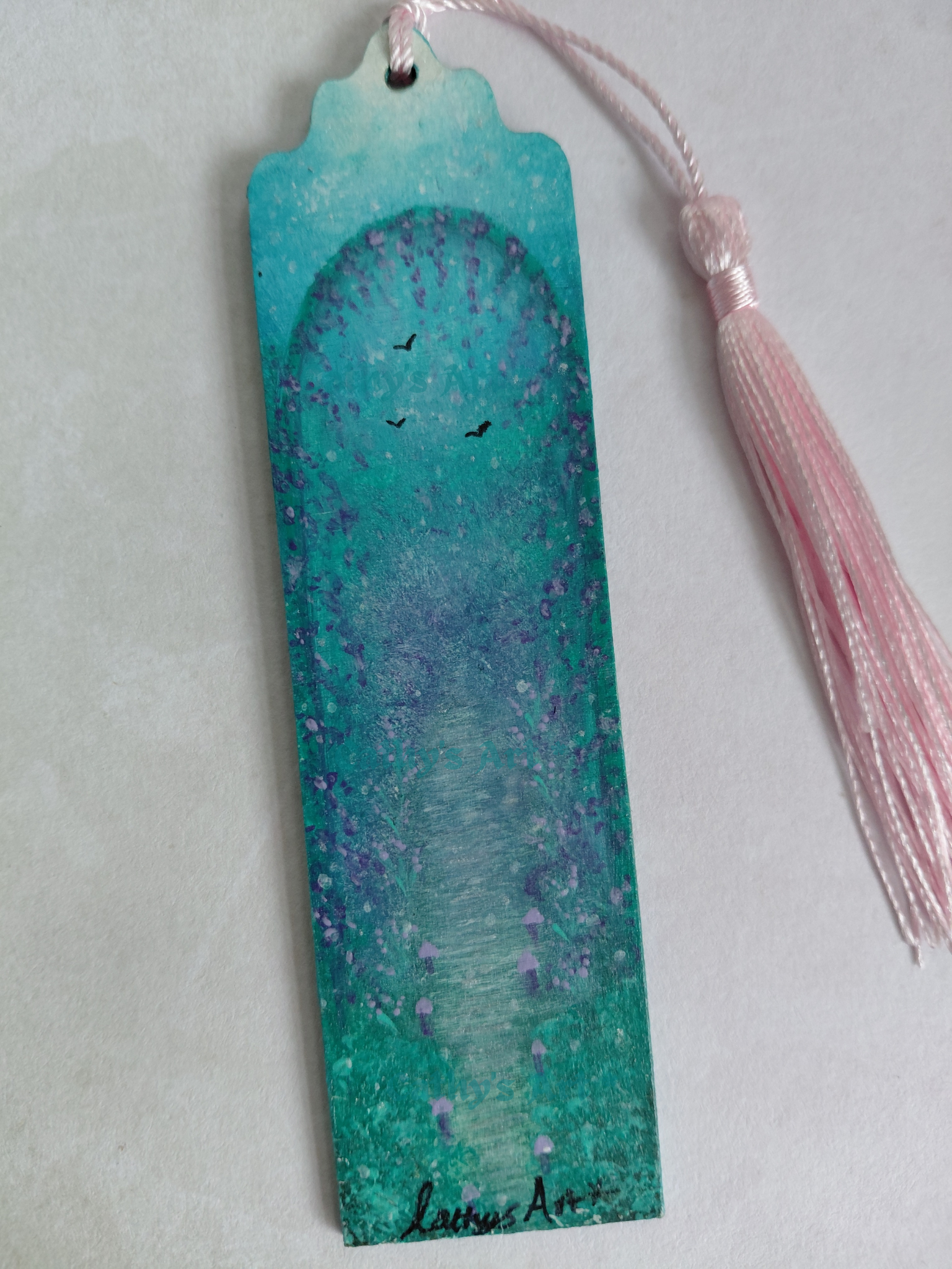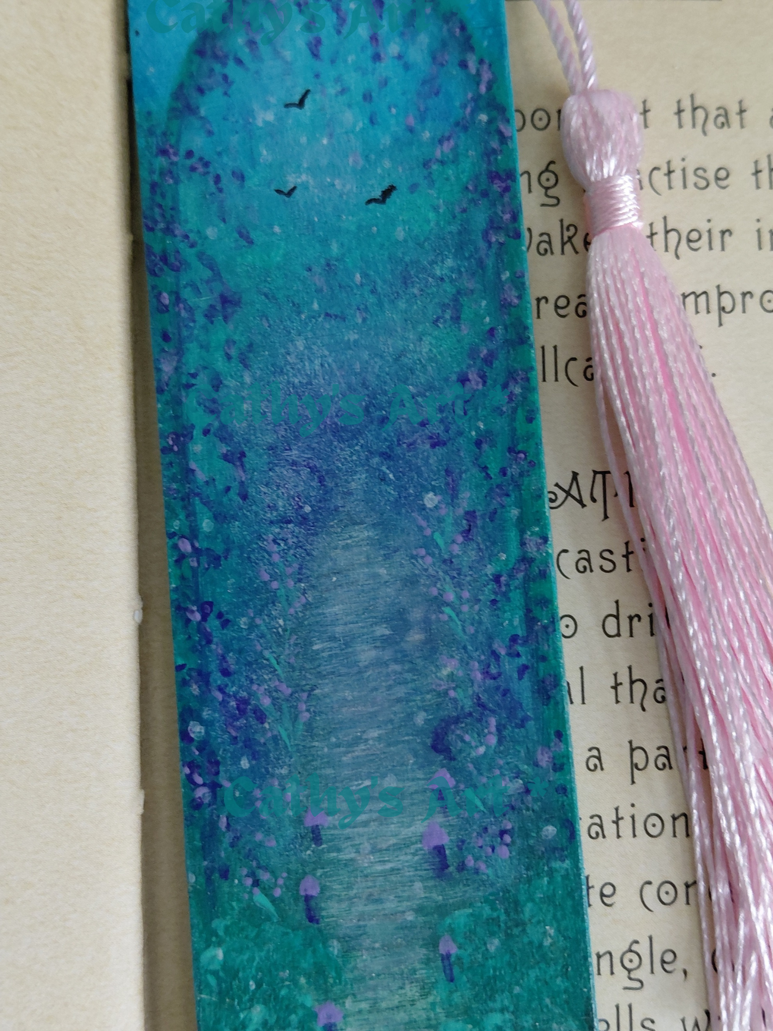 "The Secret Garden" is an original acrylic painting on a plywood bookmark. Painted in tones of turquoise, lilac, amethyst purple, dark purple, viridian green, turquoise green, black and white. I have created a beautiful archway into the Secret Garden, with trailing purple flowers. The archway sits against the dreamy turquoise sky and blackbirds fly. Sweet lavender plants grow in the garden and pretty lilac flowers and lilac mushrooms grow along the side of the shimmery pathway. I have used metallic acrylic paints to add shimmer to the path.