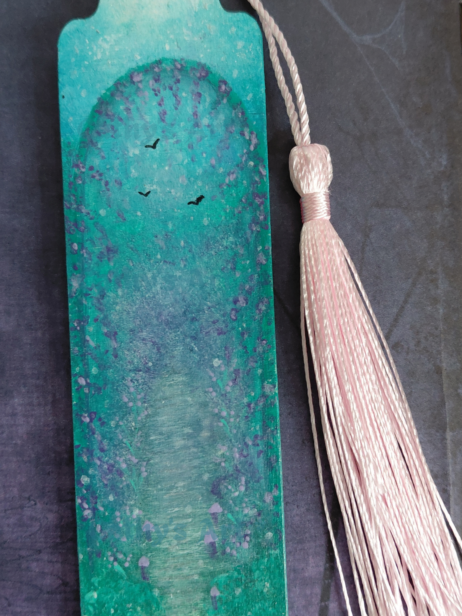 The plywood bookmark measures 12 cm in length by 3.2 cm in width. And has lovely shaping at the top where the ppalepink tassle hangs from. I have sealed the painting with a subtle gloss finish.