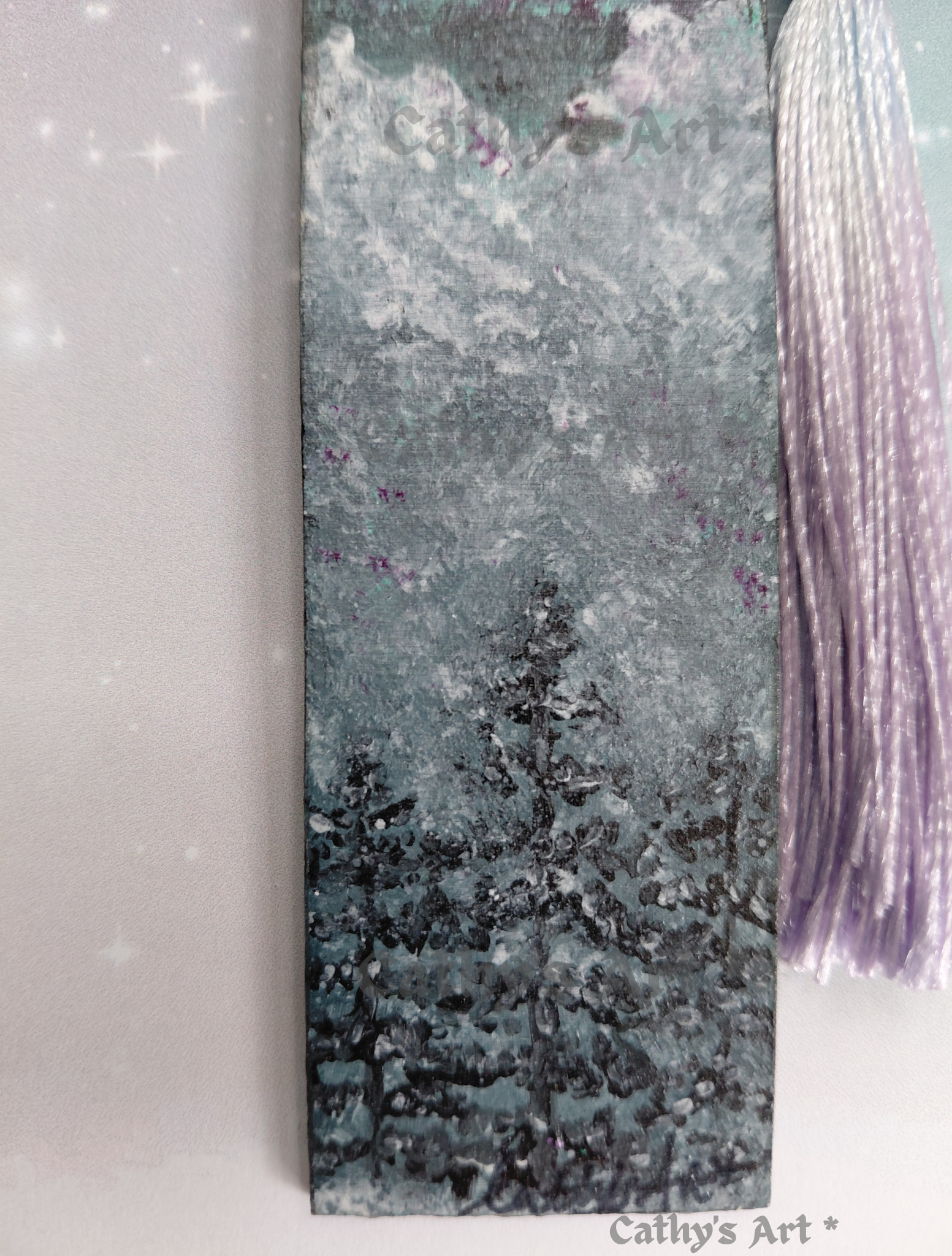 "Magical Sky" is an original acrylic painting on a plywood bookmark. Painted in colours of grey, turquoise, voilet, purple, and white. The inspiration for this bookmark is from my love of The Northern Lights, or Aurora Borealis 💙💜✨️I have added snowy mountains and fir trees with a gorgeous light show in the sky.