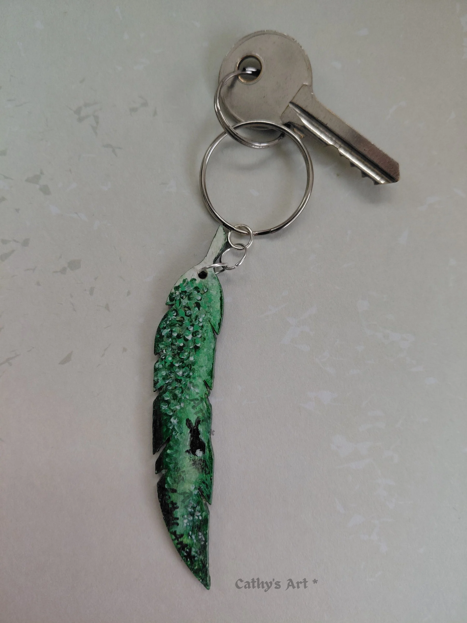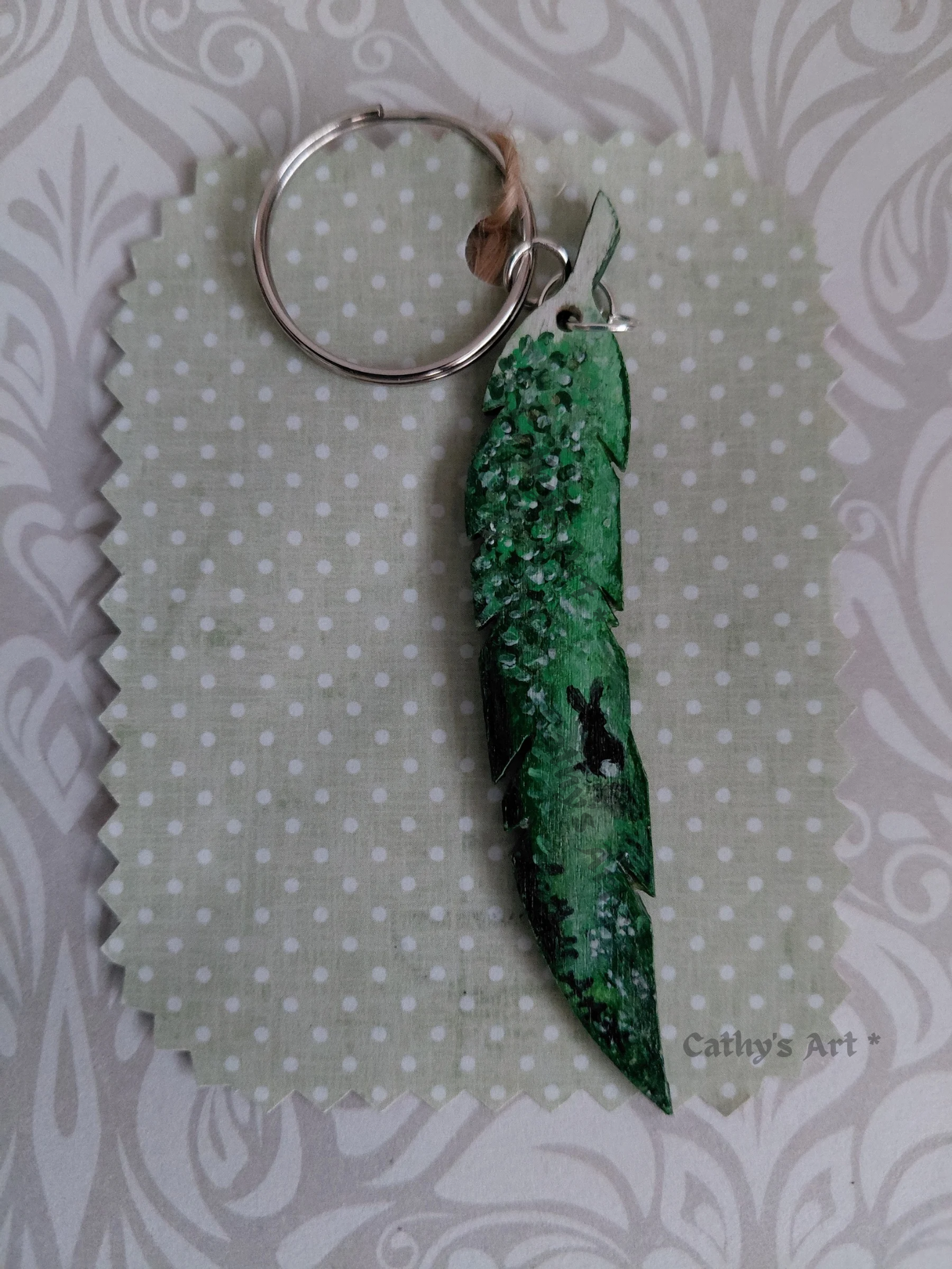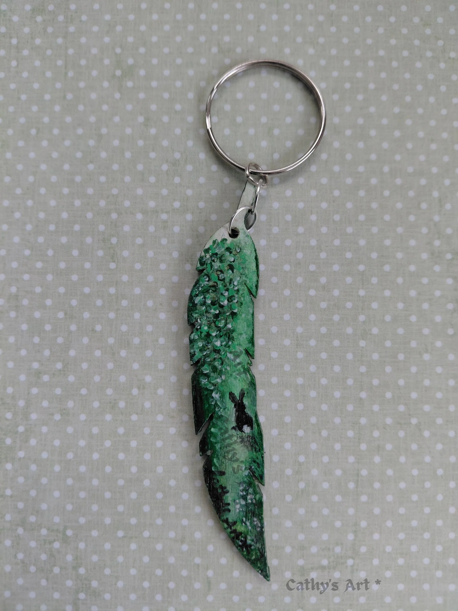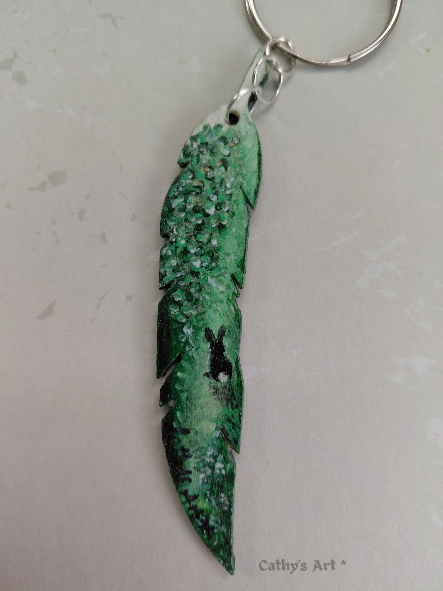 A magical minature scene, painted with acrylic paints in greens, white, and black. This painting has a magical feel with soft shades of green. Cascading floral vines, with white petals hang down towards the pathway where the little rabbit sits peacefully in this tranquil land. I finished the painting with a subtle clear gloss protection topcoat. And a 2.5 cm silver split ring to attach to your keys.
