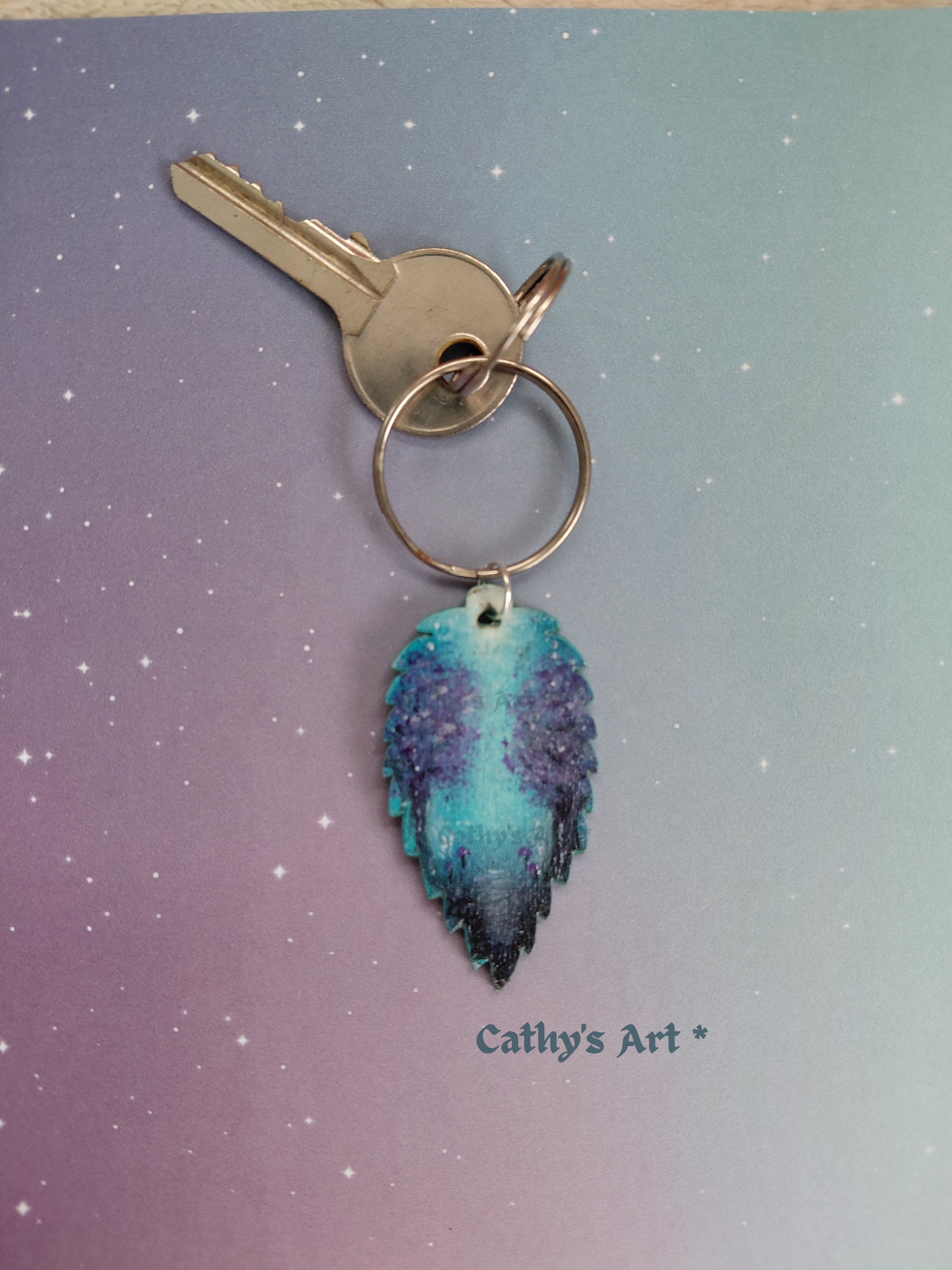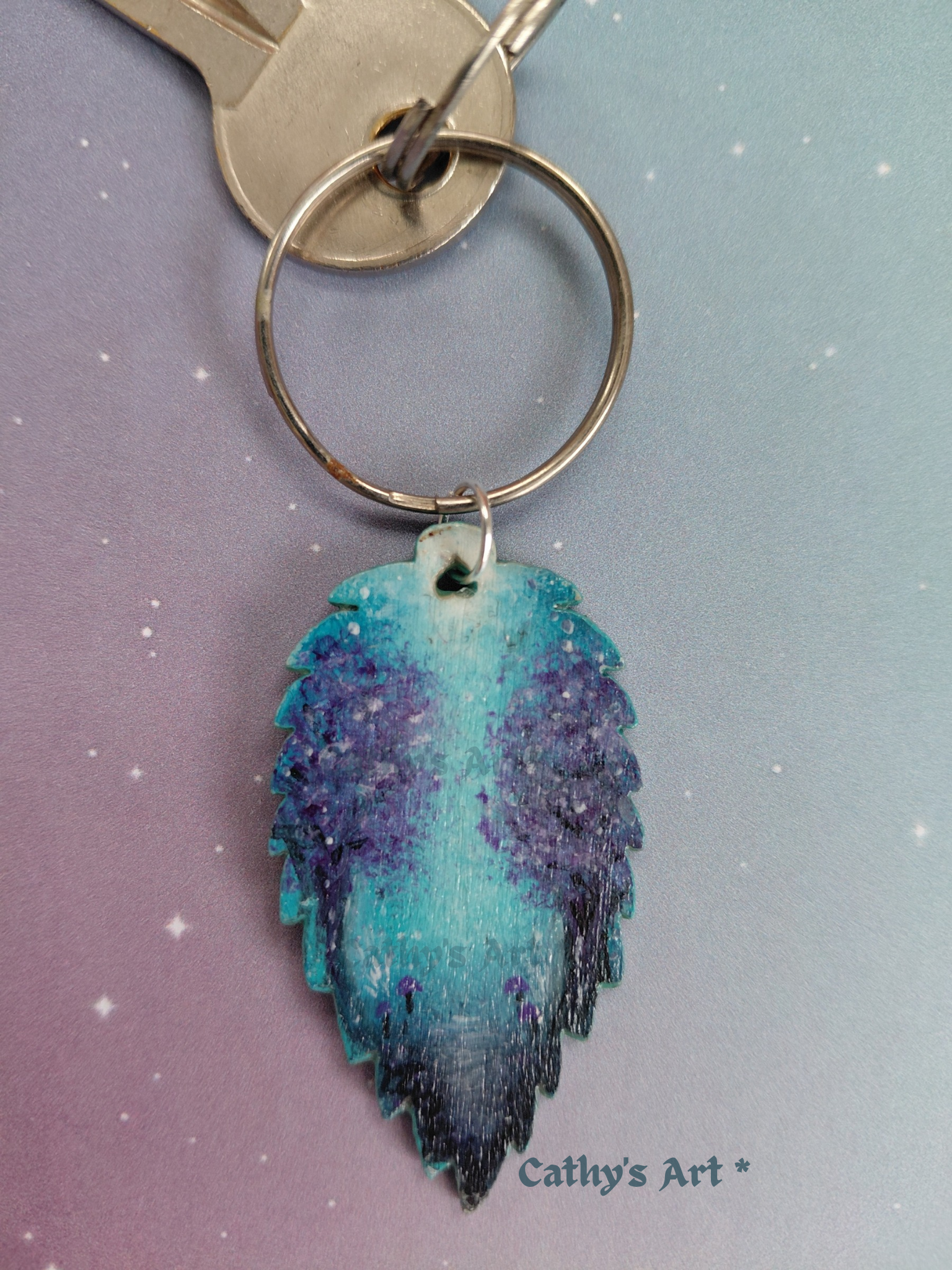 Plywood leaf shape keyring with an original mini painting "Dreamland"
