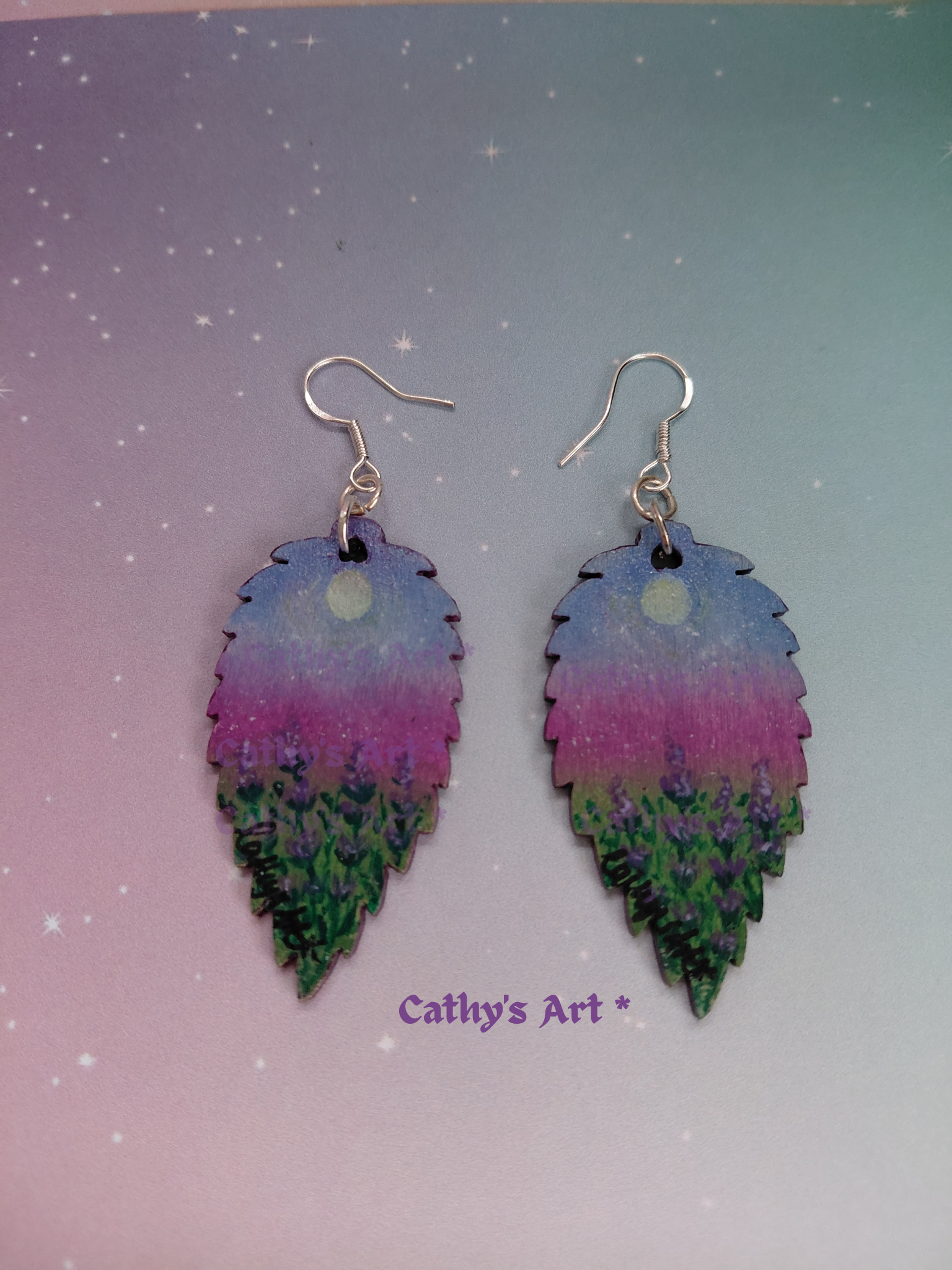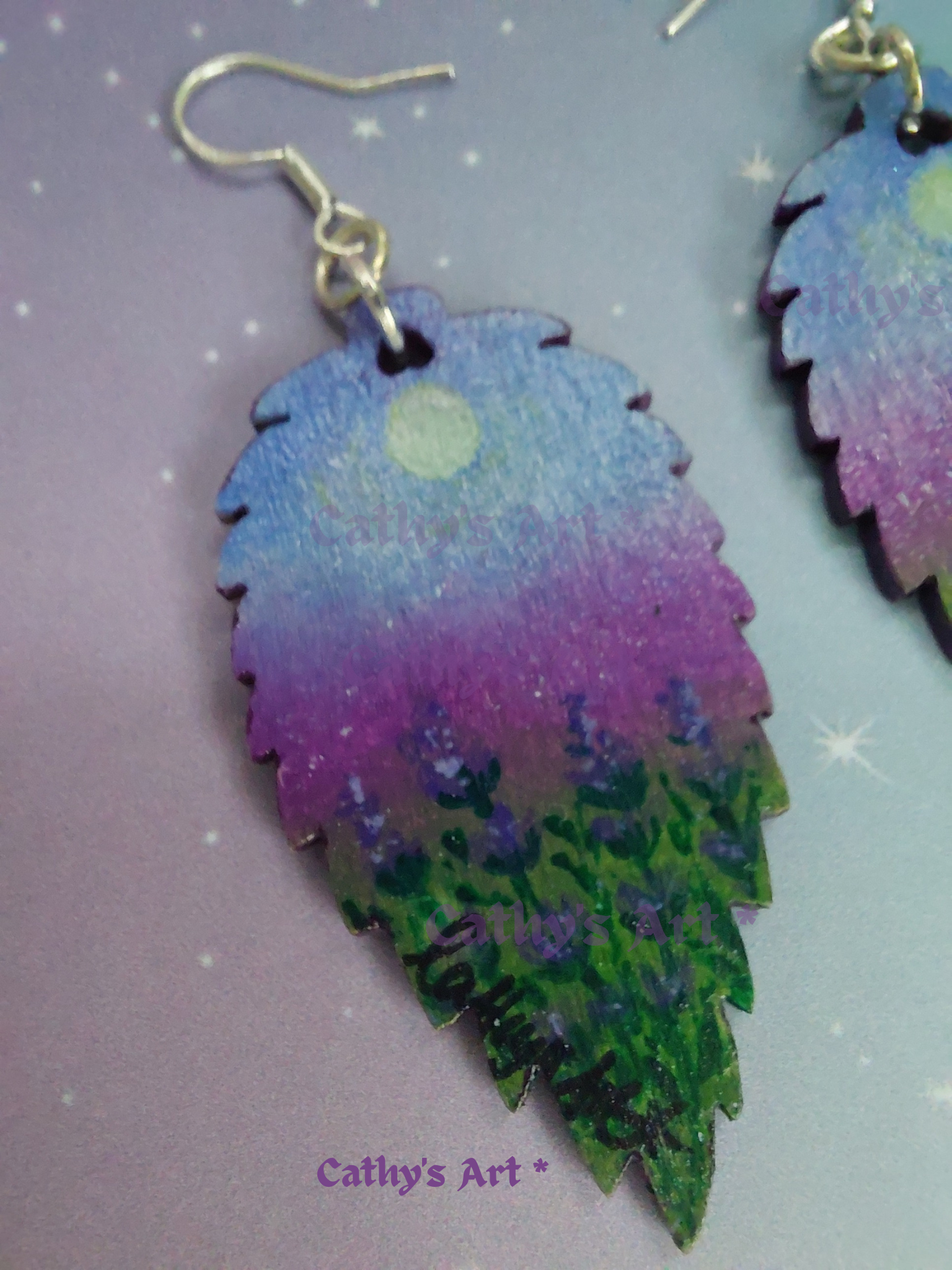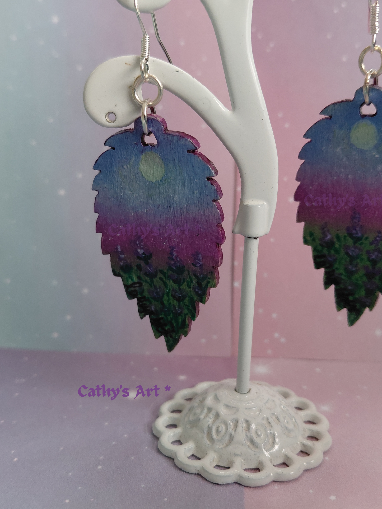 "Sweet Lavender" earrings, original acrylic paintings on wooden leaves.