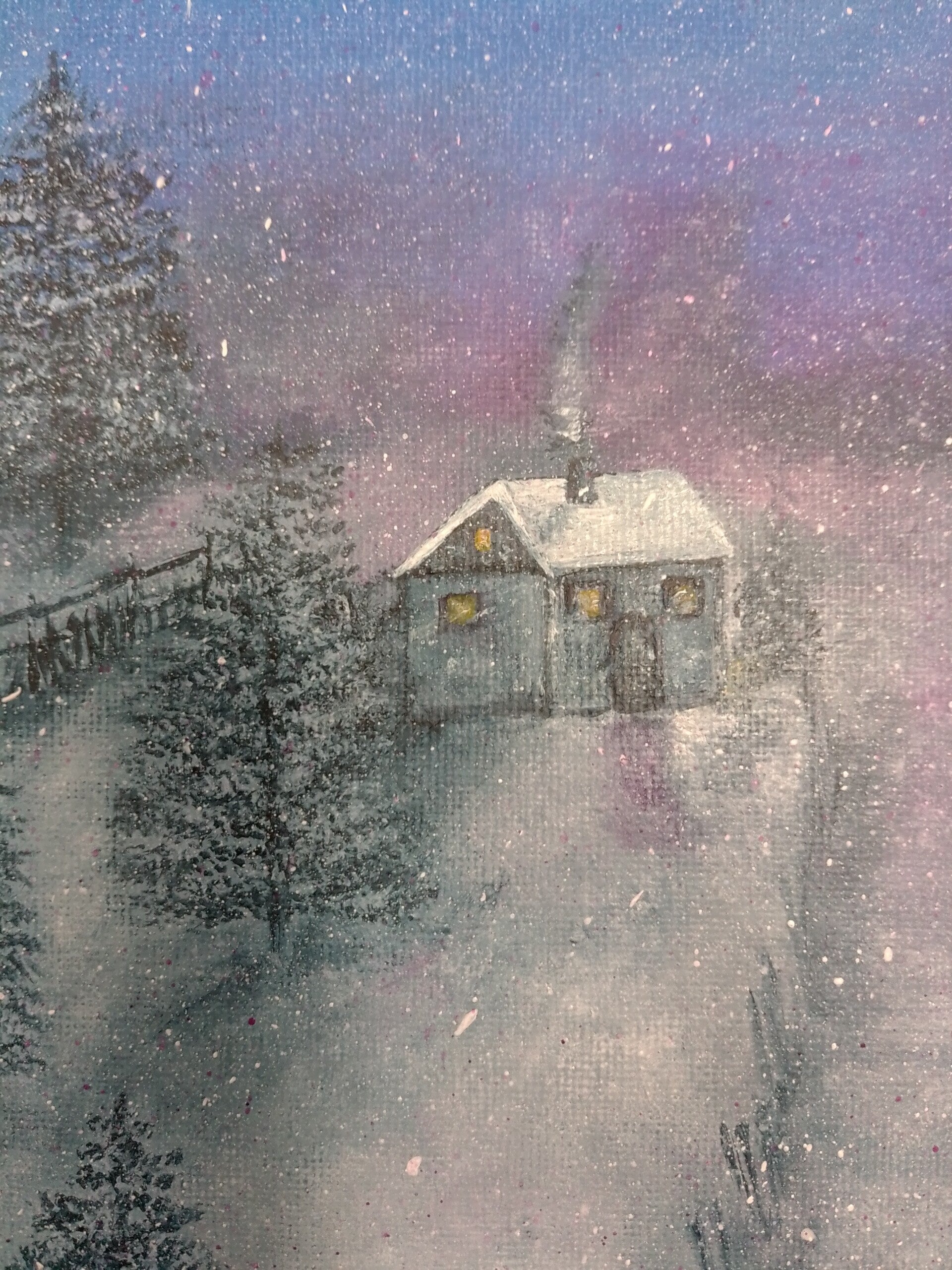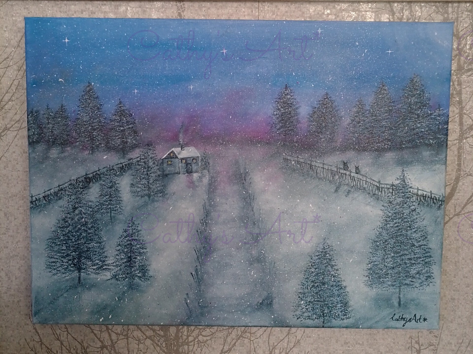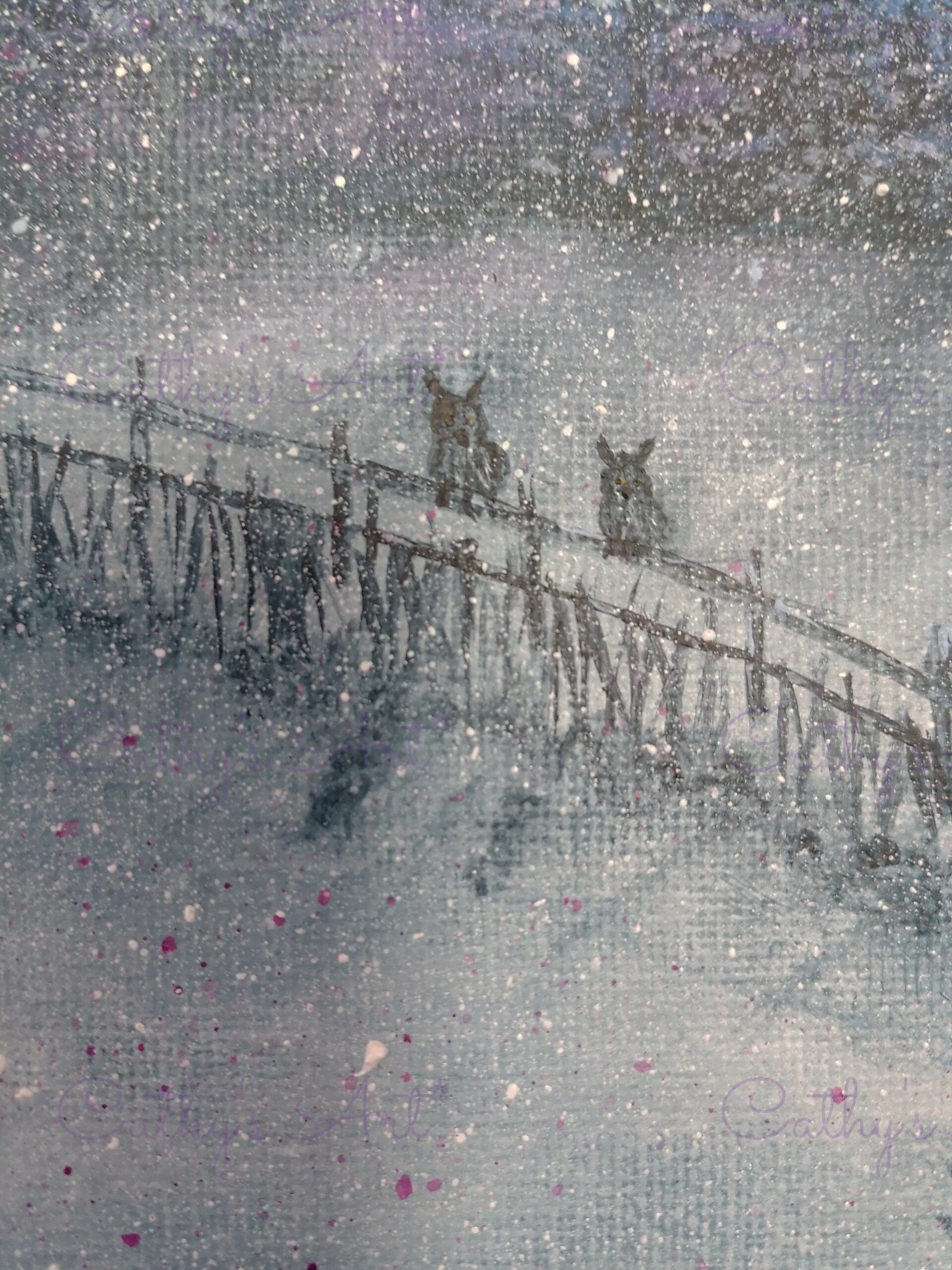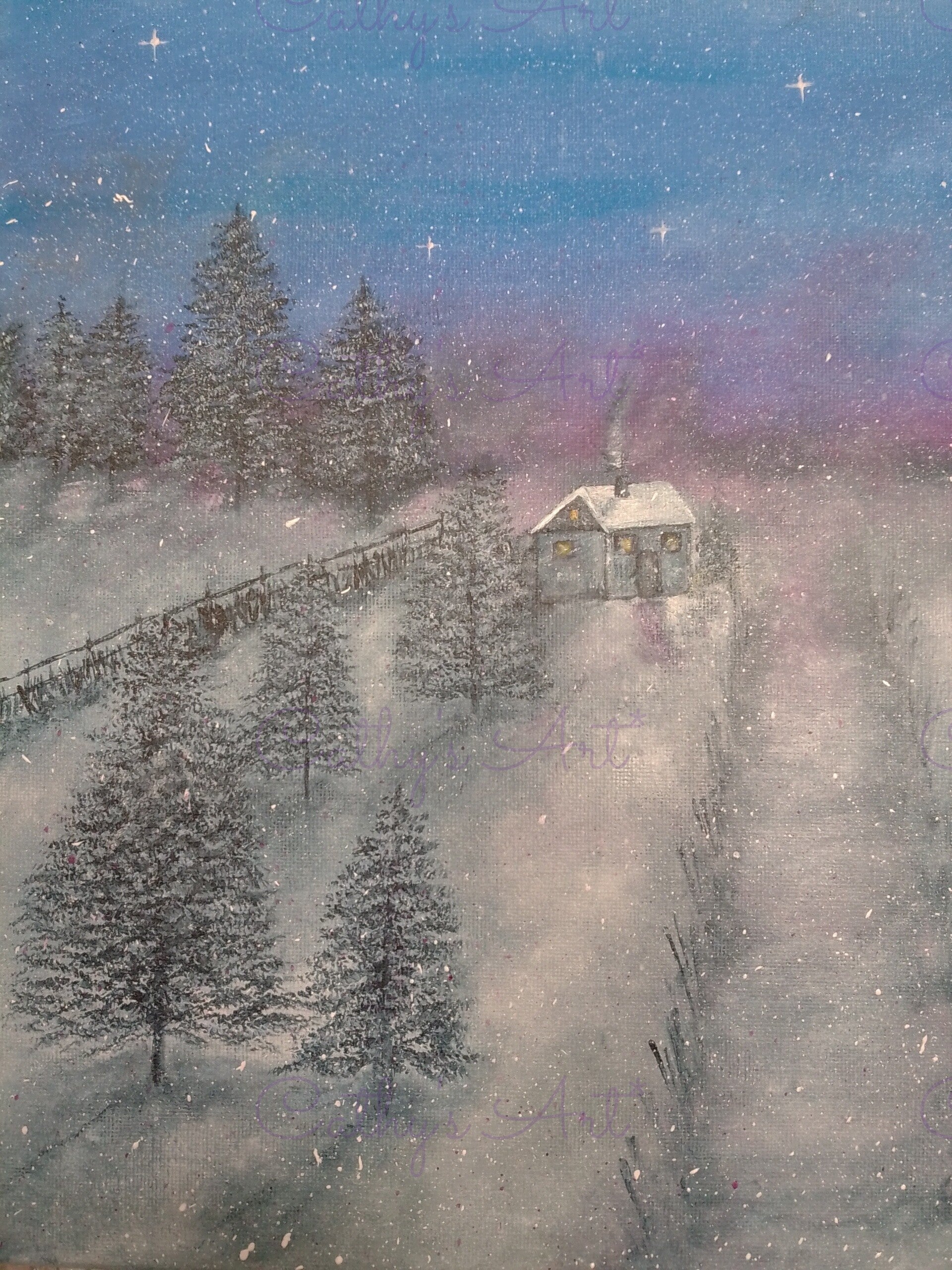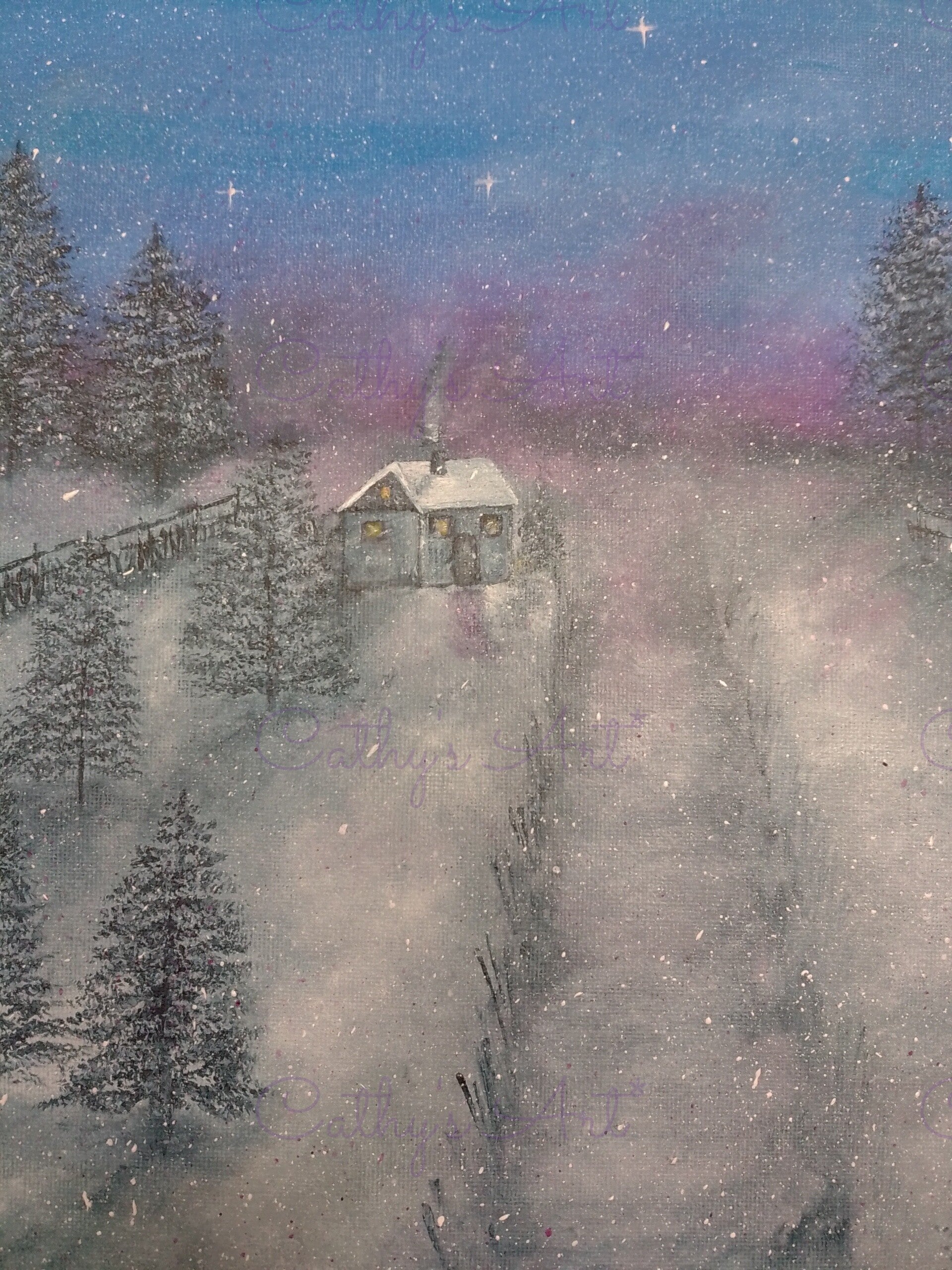 Introducing "Winters Eve", an original acrylic painting on a 12 x 16 inch stretched canvas. In colours of blues, white, greys, violet and black. The painting is a scene from my imagination, a starry evening sky, falling snow, snow covered fir trees and a cosy cottage, where smoke rising up from the chimney. Two little owls sit on the fence in this magical place ✨️