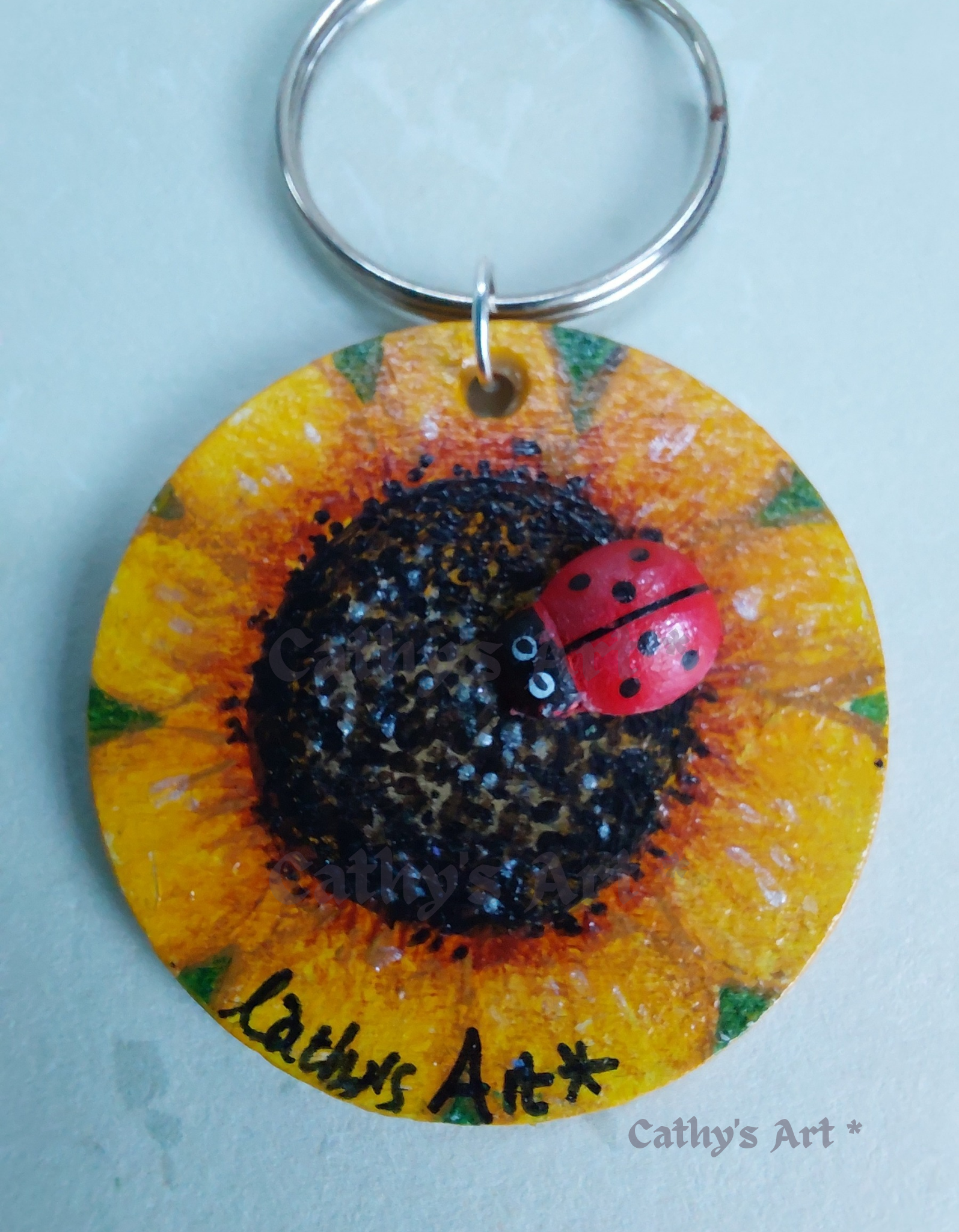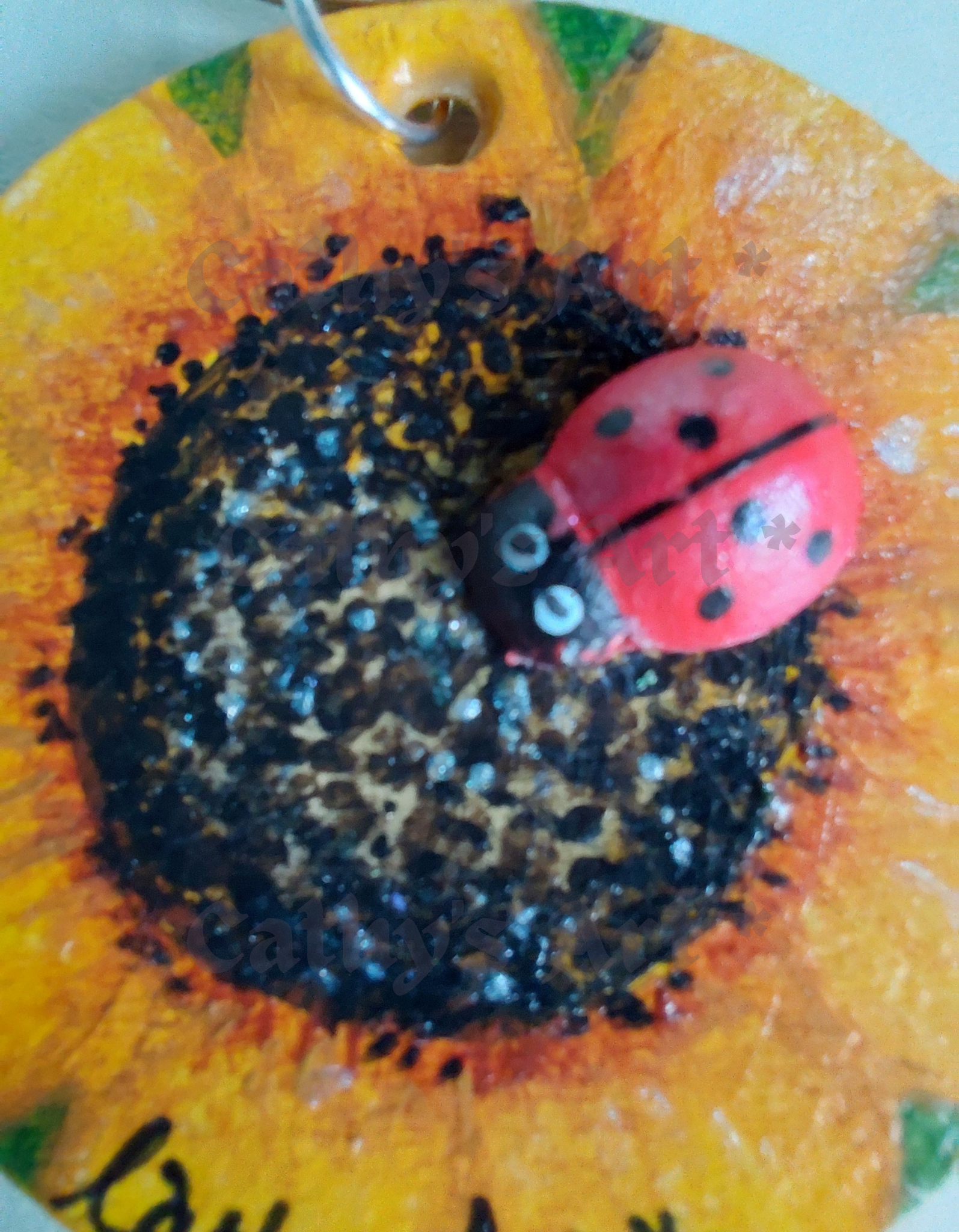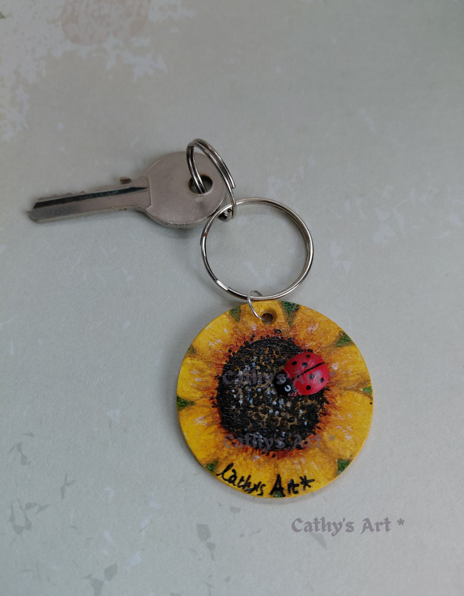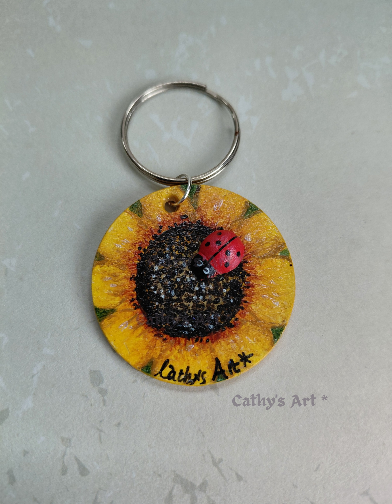 Plywood round keyring with an original mini painting "Sunflower & The Ladybird"