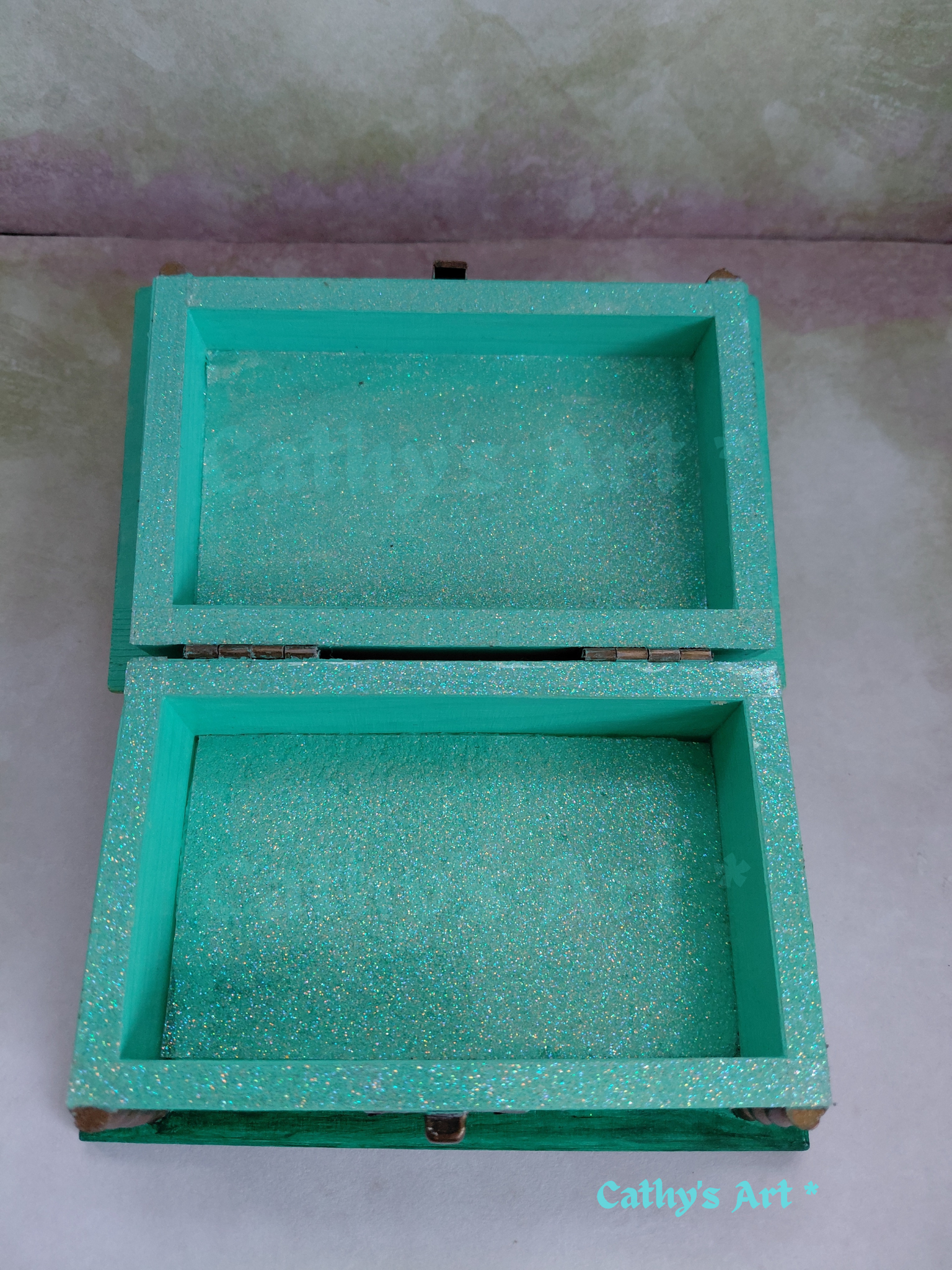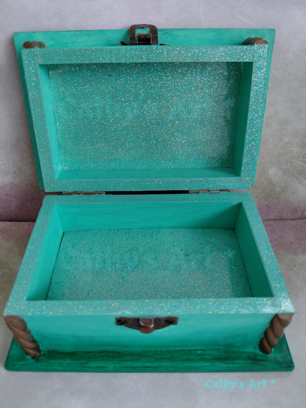 The box measures 9 cm x 14 cm x 7 cm. It has bronze metal hinges and opening clasp. I have added a clear glitter wipeable sticker to the inside of the box, ( the bottom section has a sponge base underneath the glitter ). I have also given the box a clear subtle topcoat to protect the paint work.
