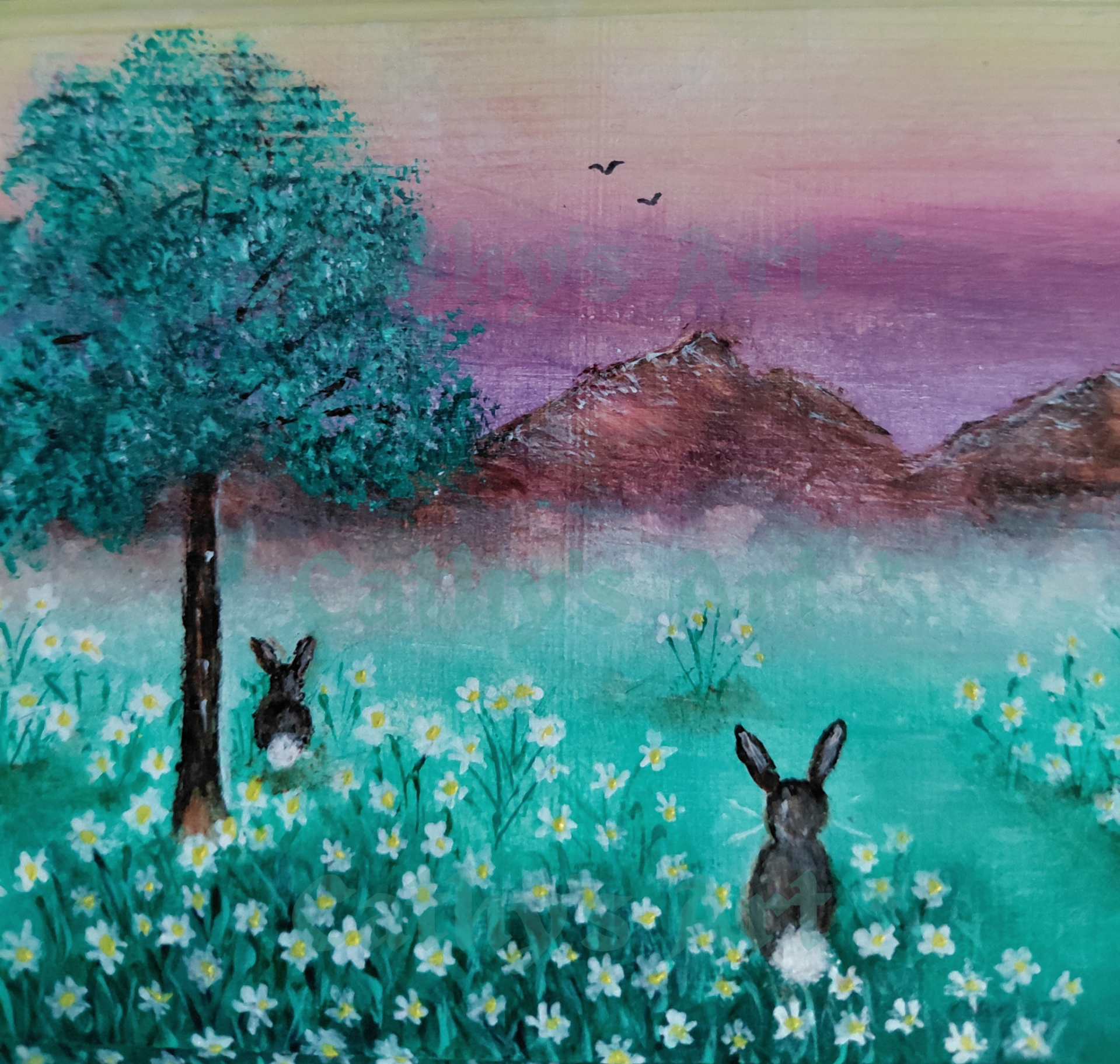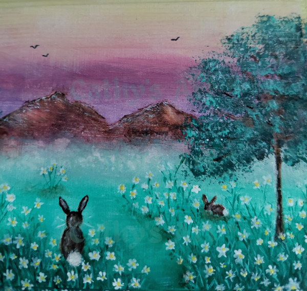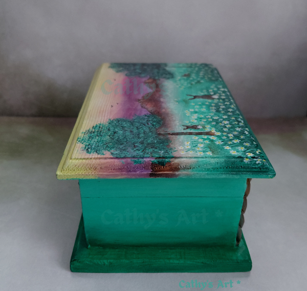 "Wild Daisies" is an original painting on a wooden box. The main painting is hand painted on the top of the lid. I have created a magical landscape in colours of lemon, yellow, voilet, purple, browns. viridian green, turquoise green, and white acrylic paints. In the distance, mountains shape the backdrop agaisnt the yellow violet skyline where birds fly high. Two trees and wild daises grow covering the floor of this magical land. Amongst the daises you will find three rabbits.....🐇🌳