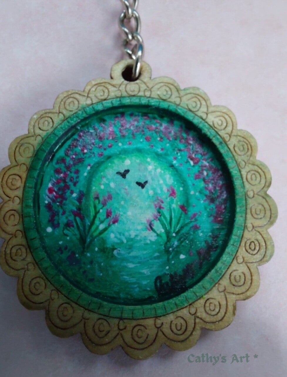 "Mystical Garden" is a hand painted original miniature painting on a wooden keyring. Painted with acrylic paints in viridian geen, pale green, mauve, and white tones. The keyring is a decorative flower shape with a inner section where the painting is, making it looked framed. I finished off the painting with a subtle clear gloss proctection topcoat, a chain and a 2.5 cm silver split ring to attach your keys.